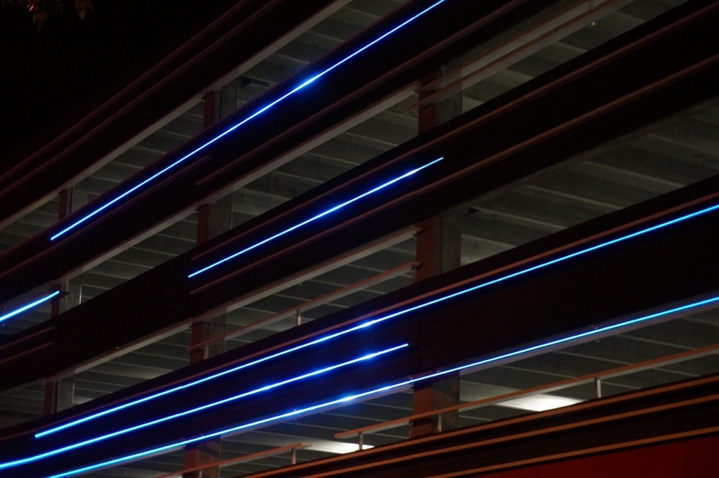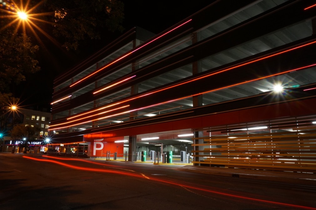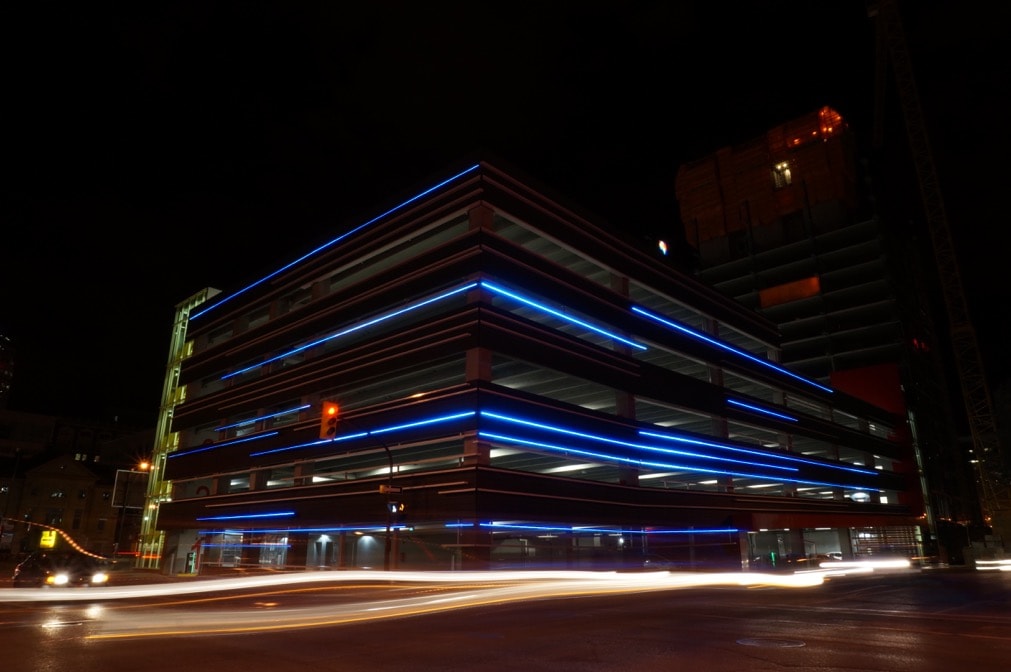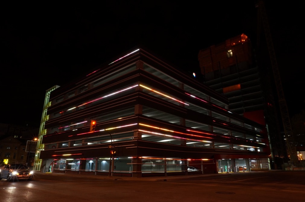The original intent put forward by Stantec was to create the representation of trailing car lights captured in a long exposure photograph. The exterior of the parkade is marked with striations of linear horizontal aluminum fins in which SACO’s V-Stick system is perfectly integrated.