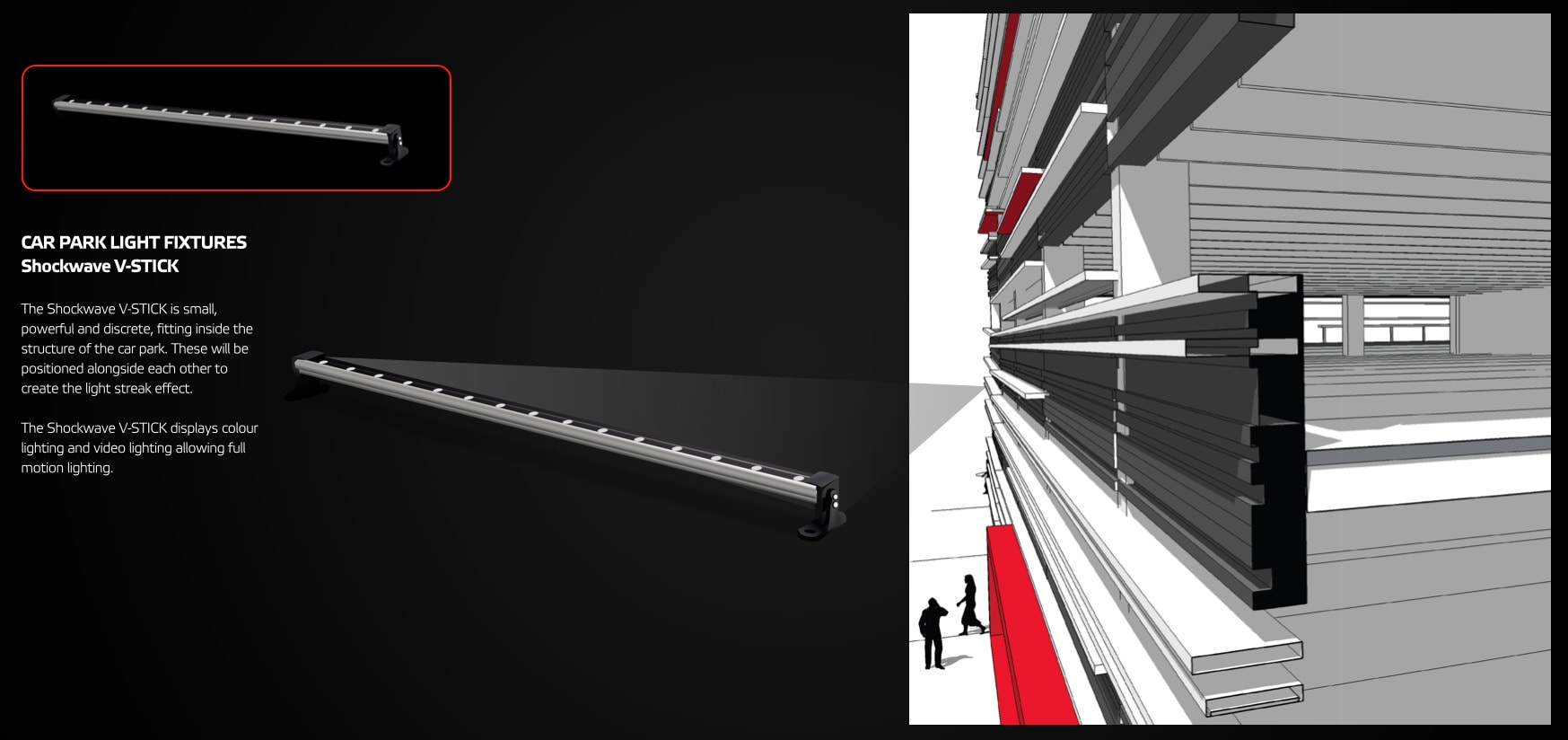 SACO Design Lab pushed the envelop by creating a custom carrier for the V-Stick system which seamlessly matches the building fin material and color. The installation appears to be an extension of the red horizontal fins rather than a simple “add on” component. The entire system was created with ease of service in mind, utilizing a combination of quick connect IP67 connector, IP67 LED Video Lighting fixtures and quick release brackets.