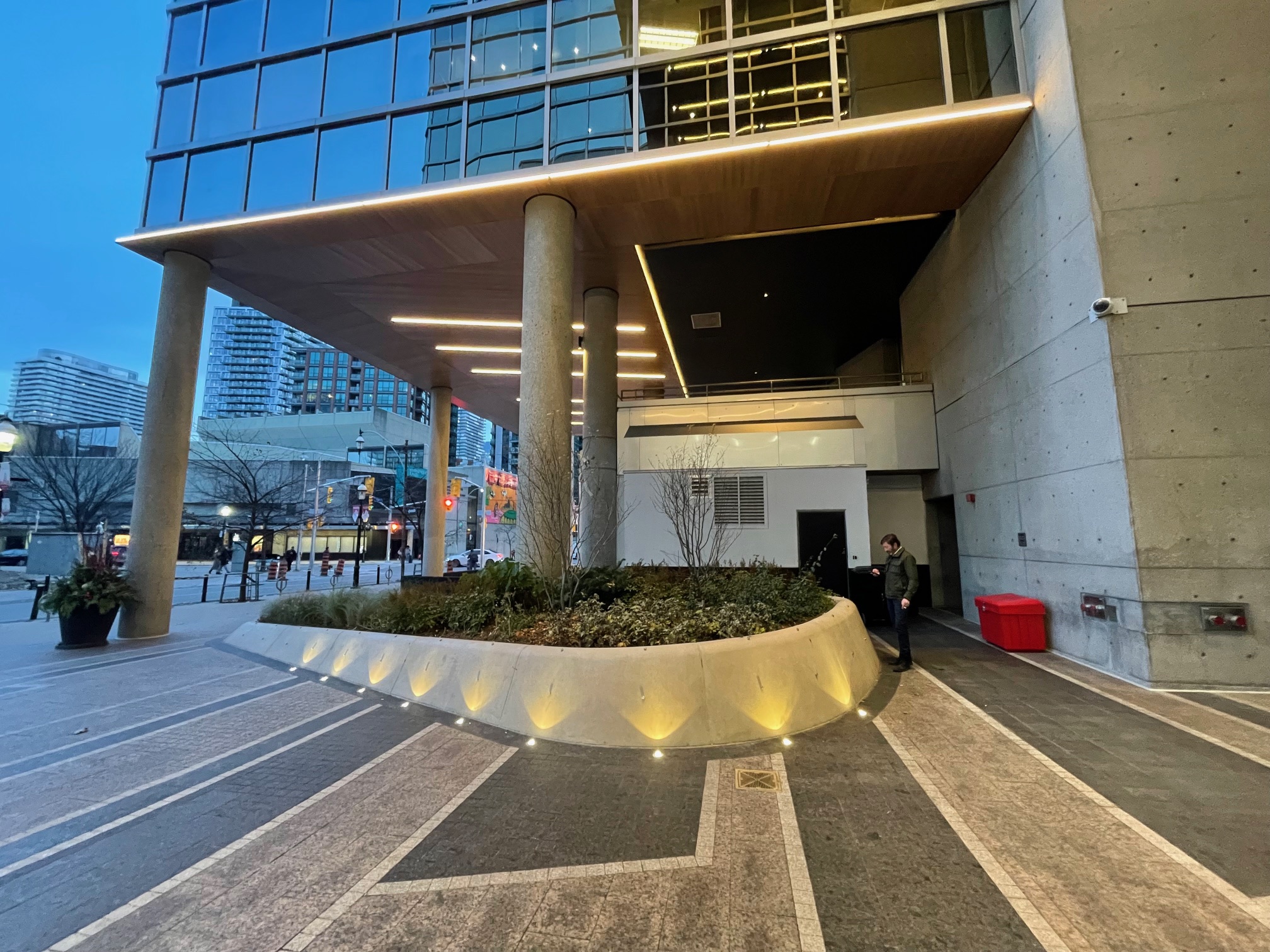 Supporting layers of illumination include Lumenwerx Aera 4 recessed downlights, Via 2 Seal recessed fixtures, and Aera 3 cylinders for functional and architectural lighting. Luminii Kurba and Trident Recessed Outdoor fixtures provide accent lighting, while Zaneen Micro fixtures enhance wayfinding and highlight landscape architectural features. The result is a refined and unified nighttime identity for 33 Yonge Street that balances architectural emphasis, functionality, and visual continuity within Toronto’s urban streetscape.