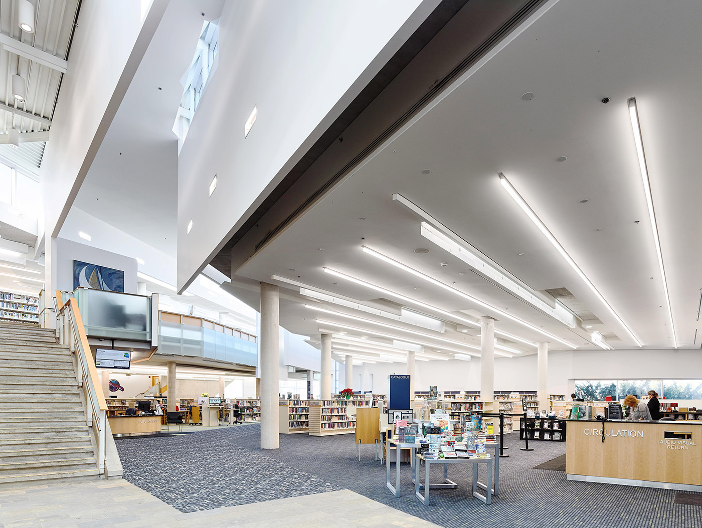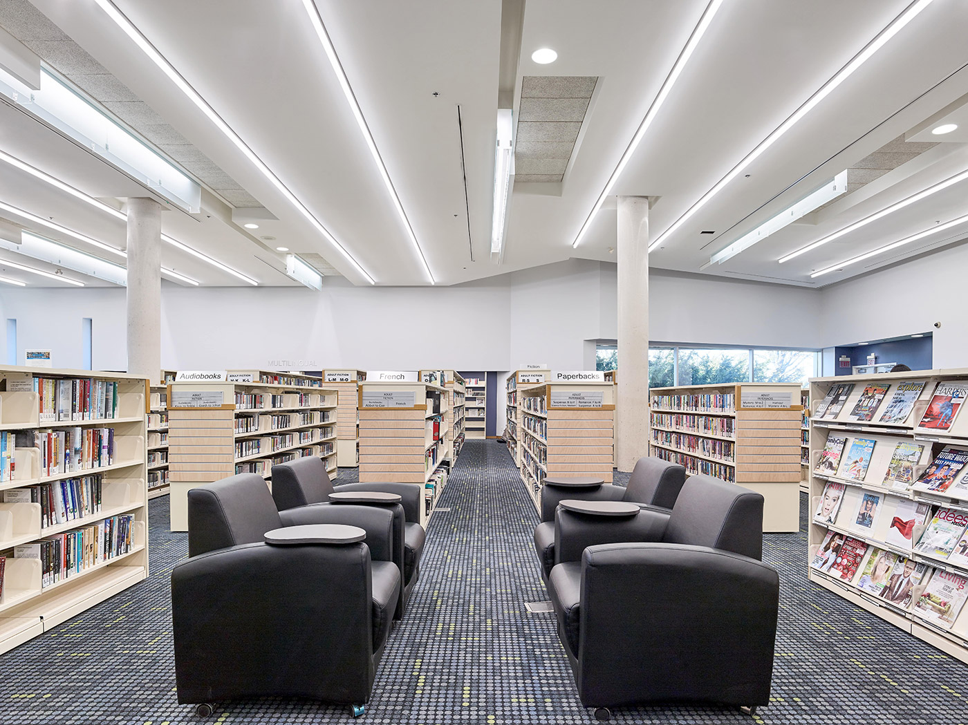 Good light can make all the difference, especially when it comes to a reading environment. Constructed in 2002, the Ajax Library was created as a new community hub for the surrounding community of Ajax, Ontario. Well loved and visited by families across the city for over a decade, Ajax Library was in need of a lighting makeover – the goal? To retrofit their existing T5HO fluorescent striplights to accommodate new, modern fixtures that would reduce glare and encourage easier maintenance.