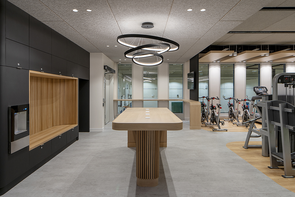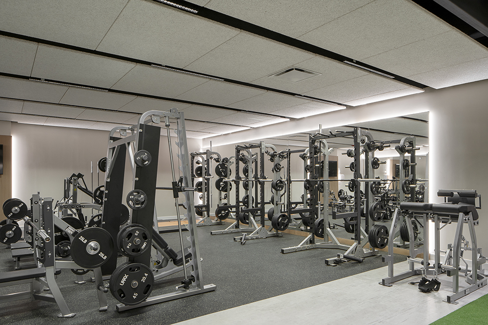 The lighting design featured Senso Leto 11.5 cylinders, which were installed in the main area of the gym including above the cardio machines and turf. These pendants fit seamlessly within the ceiling system, providing a clean and even illumination. The Luminii Bara was used to outline mirrors in the yoga room and weight area, offering functional lighting for precision-focused activities. In the yoga room and reception area, Aera 3 downlights by Lumenwerx delivered high-quality lighting, creating a serene atmosphere for yoga practice and a welcoming ambiance in the reception. For the weight area, Lumenwerx Squero fixtures were chosen for their slim profile, allowing them to fit between the ceiling’s acoustic panels while minimizing glare and delivering targeted lighting. The RIM Multiple Pendant by Lumenwerx added a decorative and functional element to the reception area, contributing to the stylish and welcoming environment. Throughout the gym, Wattstopper Controls provided full dimmability and occupancy-based operation, ensuring energy efficiency and flexible lighting adjustments. The result is a thoughtfully designed space that harmonizes diverse lighting requirements with architectural features. From the vibrant cardio and weight areas to the tranquil yoga room and inviting reception, the lighting solutions brought the gym’s vision to life.