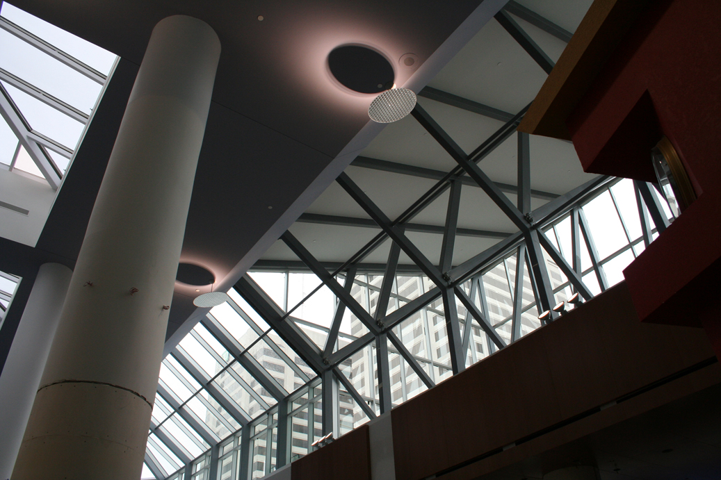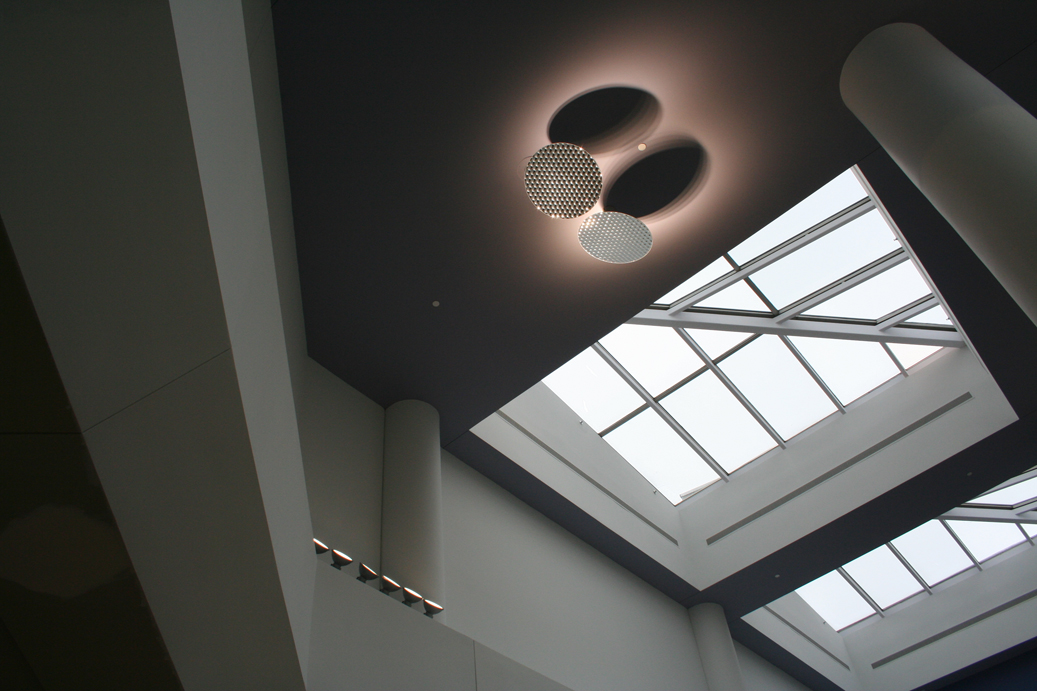 The entranceway features cove lighting that changes colour. The space has a high ceiling featuring a large, glass skylight. The client wanted the ceiling lit with colour-changing luminaires that changed simultaneously as the cove lighting in the entranceway. This task proved challenging as fixtures could not be installed directly onto the skylight. To achieve the desired outcome, Zumtobel’s mural fixtures were selected. The light source was placed along a ledge immediately beneath the skylight and angled towards reflective mural fixtures that dispersed the light across the skylight ceiling. The placement of the lamps also allowed for easier maintenance.