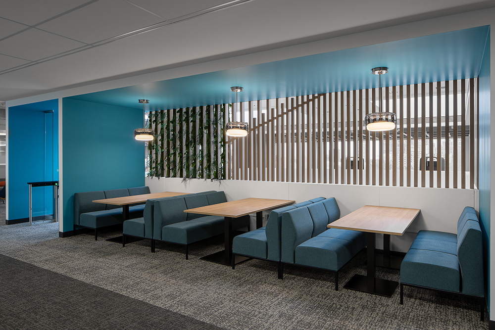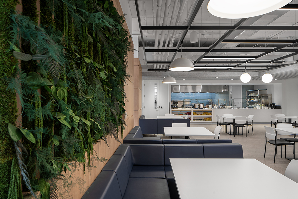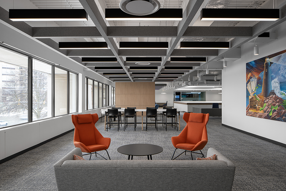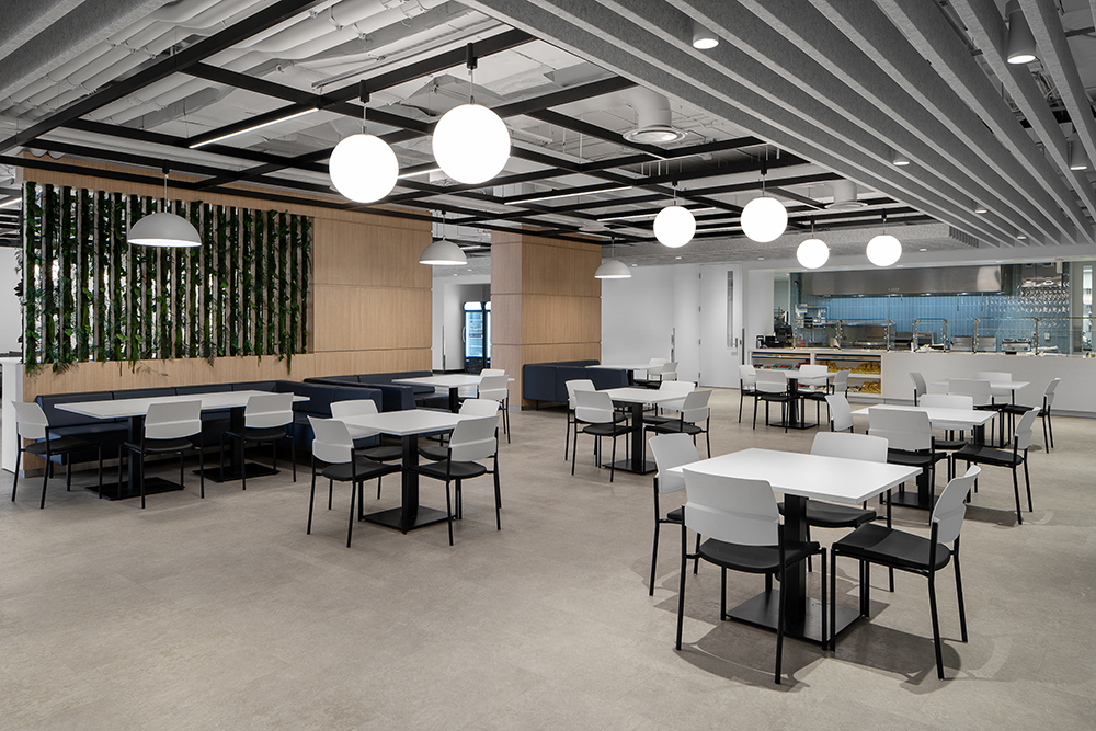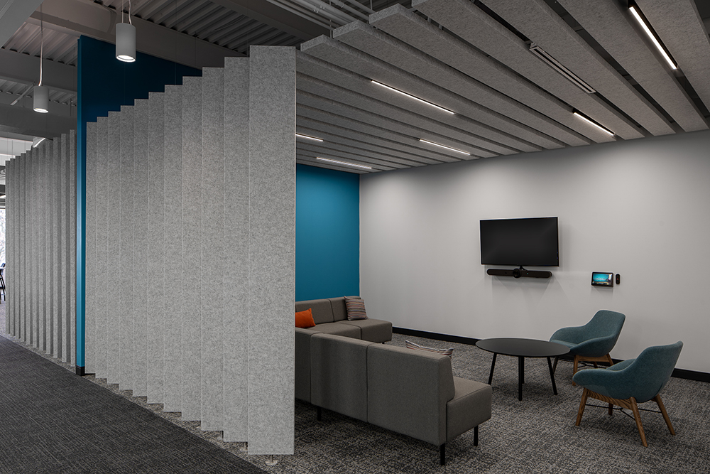 Salex worked with Mayhew and Associates and Walter Fedy Kitchener to transform the lighting at their head office in Waterloo. Several fixtures by Axis Lighting were used throughout the office, chosen for their flexibility and efficiency. The Axis StencilFlex system lights up the lunchroom and open collaborative areas, allowing for a variety of lighting insert possibilities and future relocations. Viso enhanced the system by creating custom lightweight, acrylic globe and dome pendants, equipped with Axis track adapters for seamless placement along the track inserts within the StencilFlex framework. Axis Beam 3 pendants illuminate the open seating and work spaces. Additionally, Viso produced custom acoustic linear fixtures to complement the architectural acoustic elements in the meeting rooms. Lastly, the glass pendants by Kuzco add a decorative touch, completing the office’s modern, sleek design.