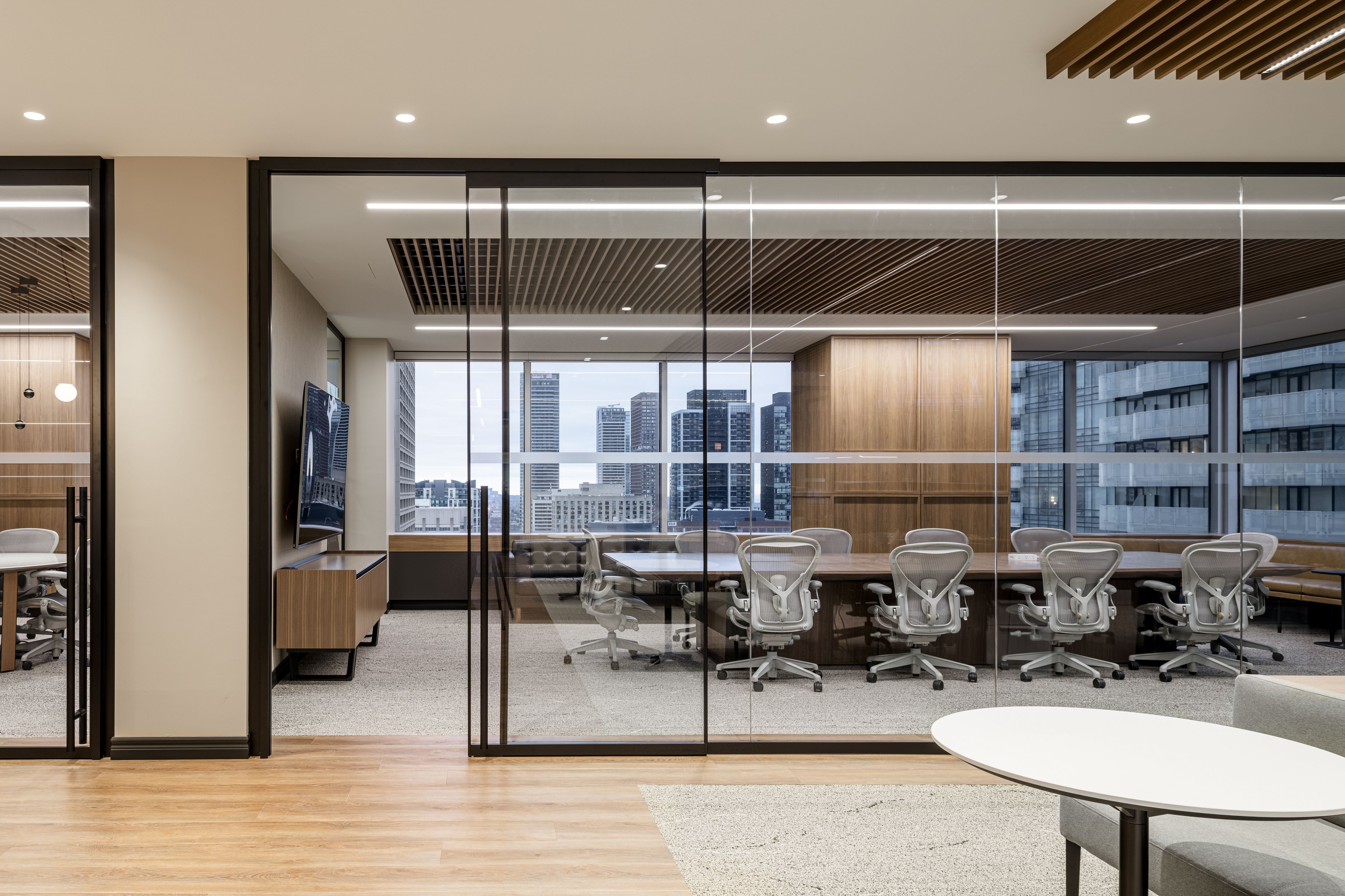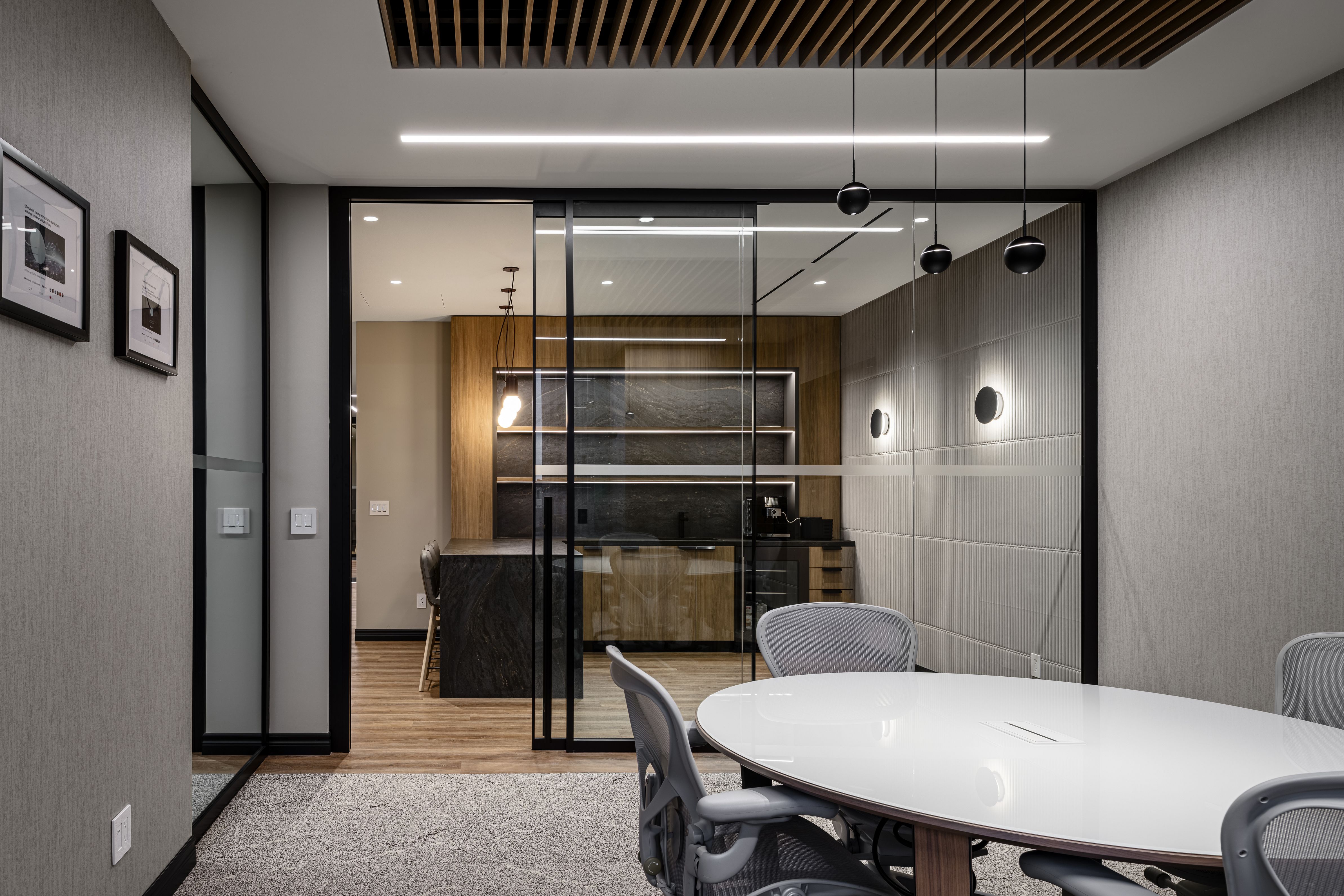 Together, these lighting elements support the design intent by balancing performance with aesthetics. The result is a polished and contemporary workplace that reflects the client’s forward thinking approach while maintaining a strong sense of comfort and sophistication.