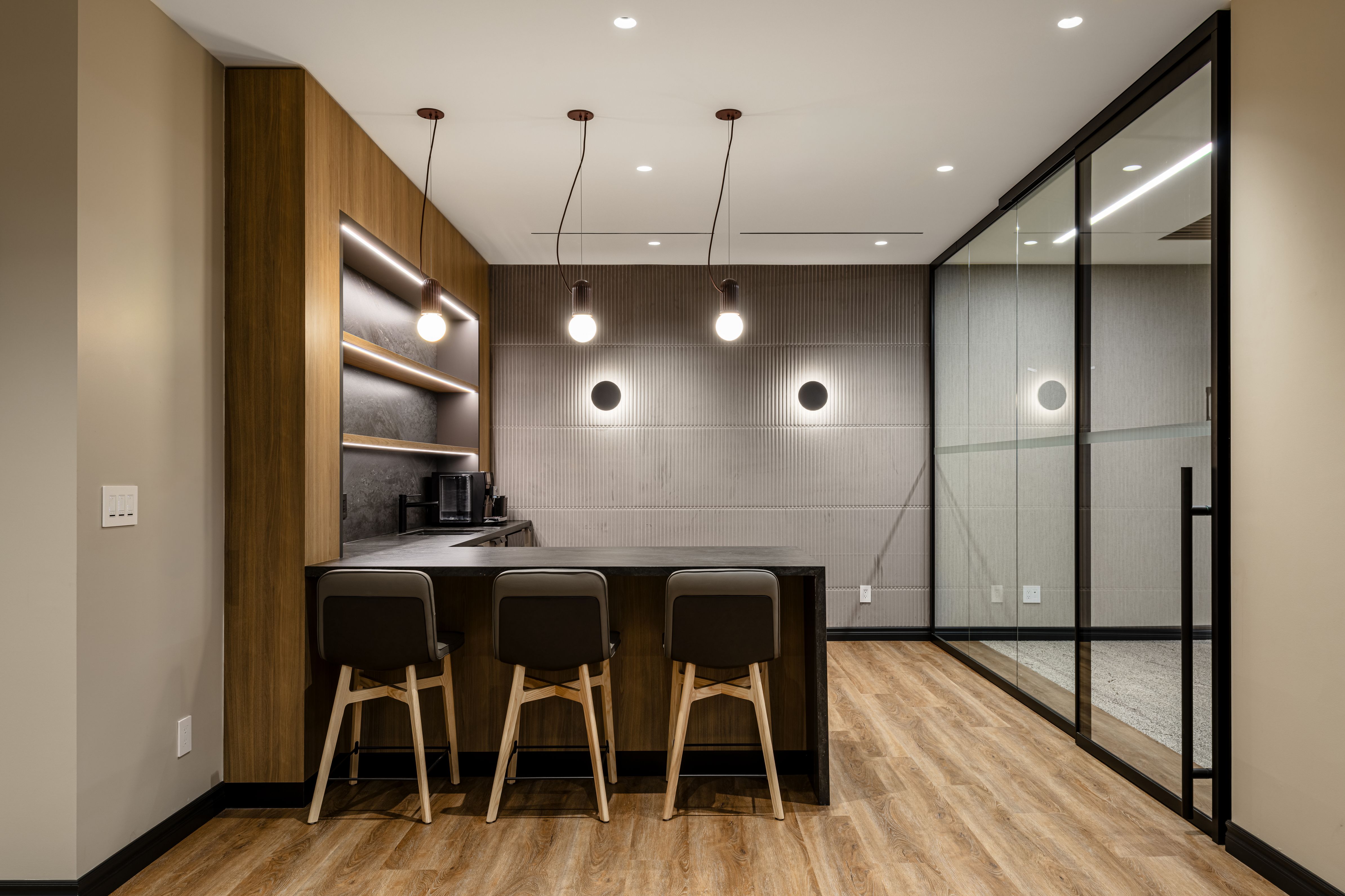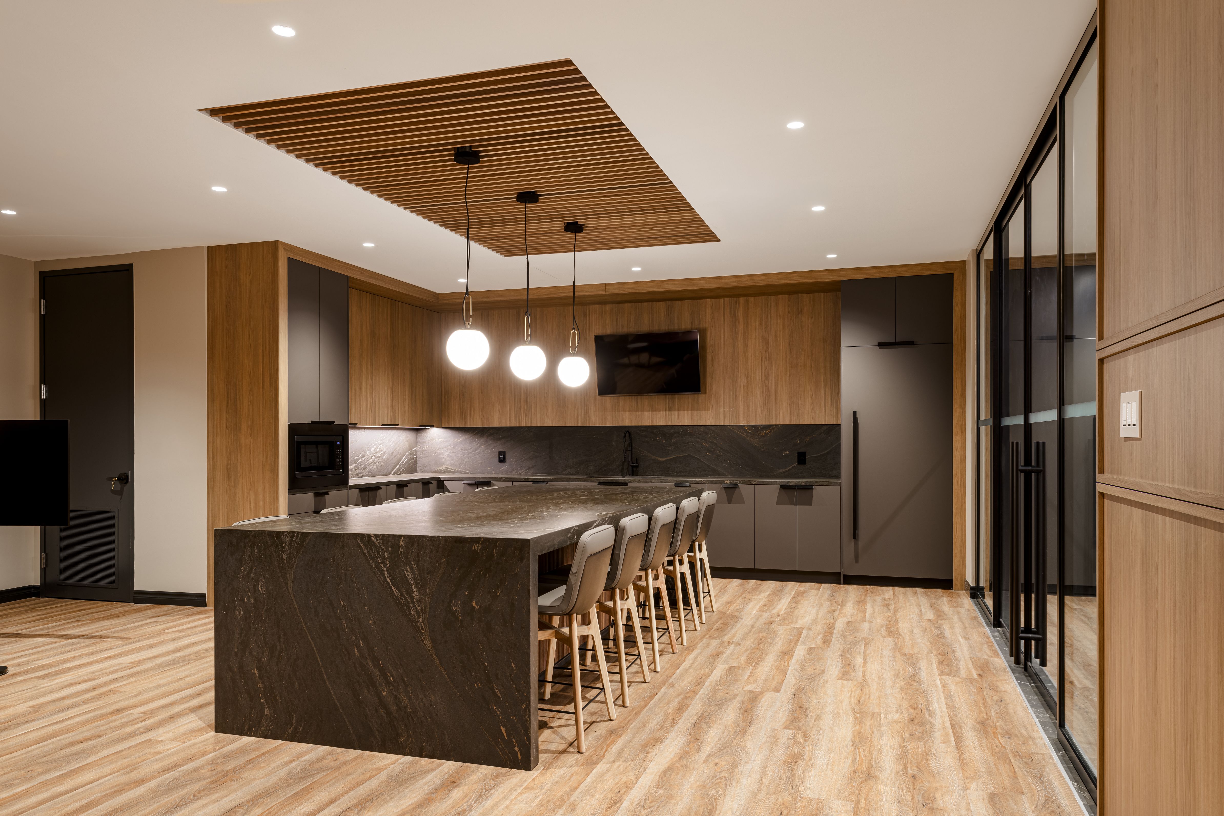 Within the main kitchen, the NH suspension by Artemide was introduced as a decorative focal point above the island, adding a sculptural and elevated touch that anchors the space. In the separate kitchenette, designed as a smaller coffee bar area, beautiful Designplan Mimicry backlit wall sconces enhance the space with a soft glow and an artistic layer. The Tungstene Ellen 05 fixture was also used over the counter, adding both function and a refined decorative element. Throughout the office, trimless Ecana downlights by Lumenwerx are thoughtfully distributed to provide clean, consistent illumination, enhancing both functionality and atmosphere.