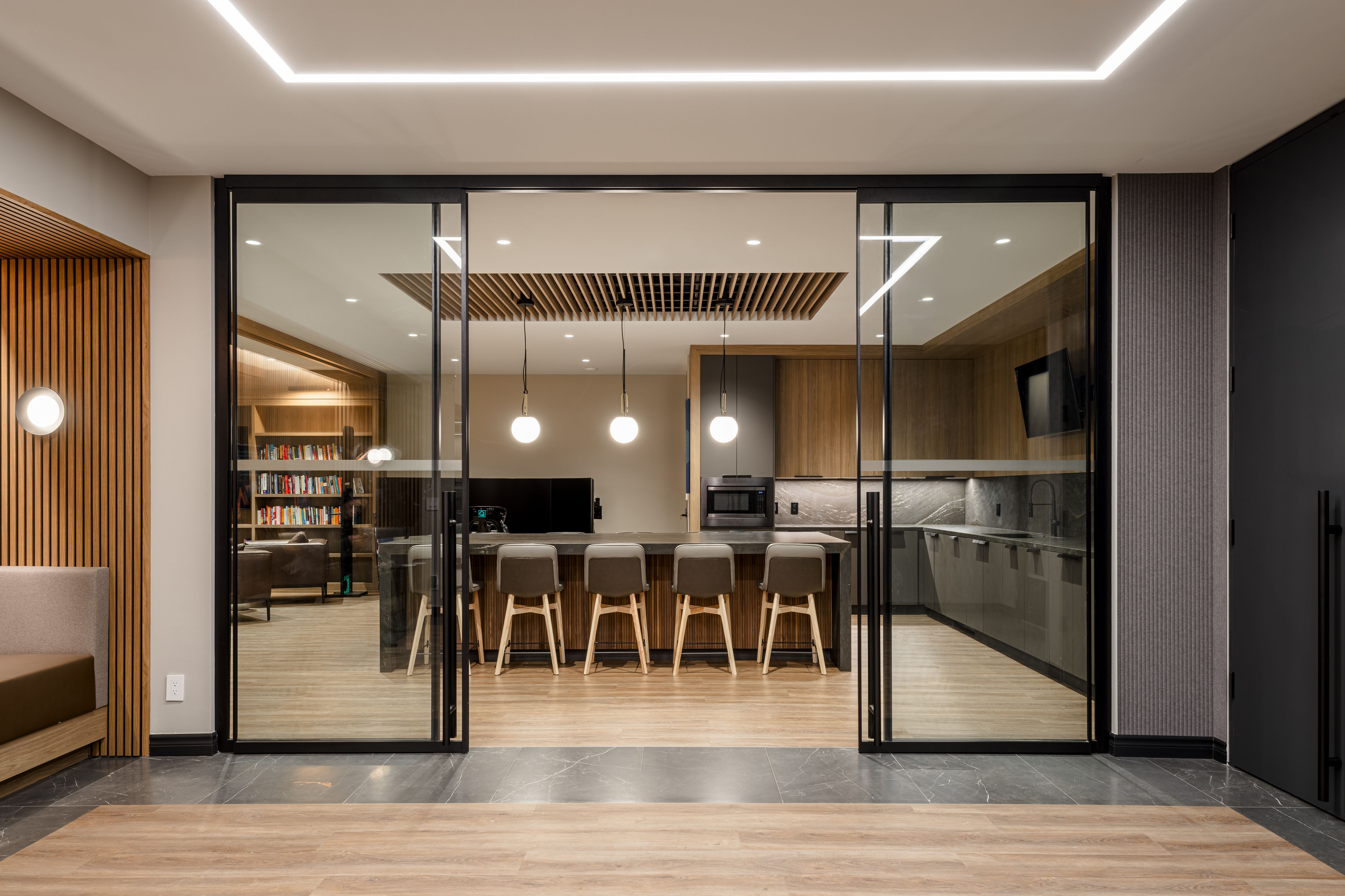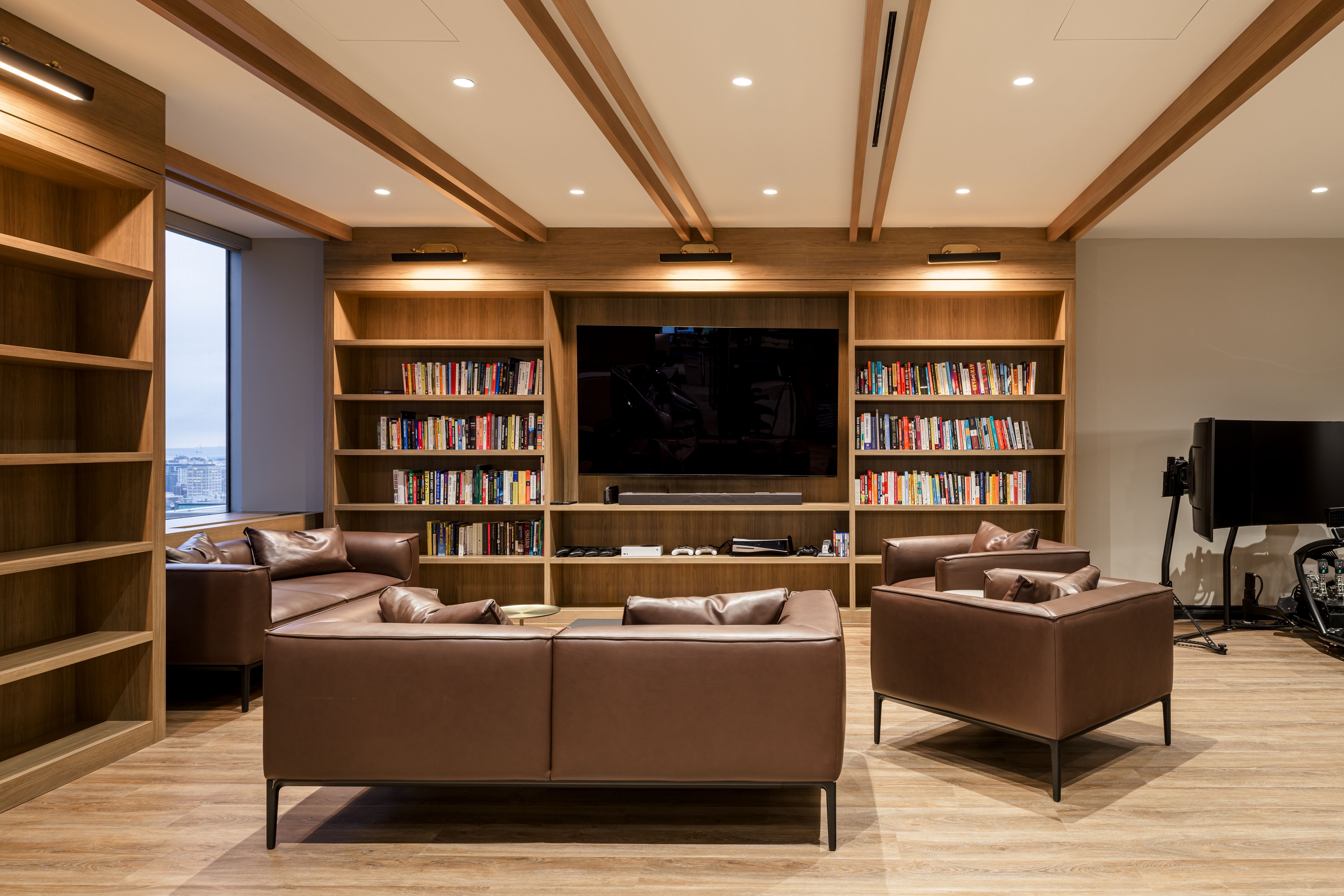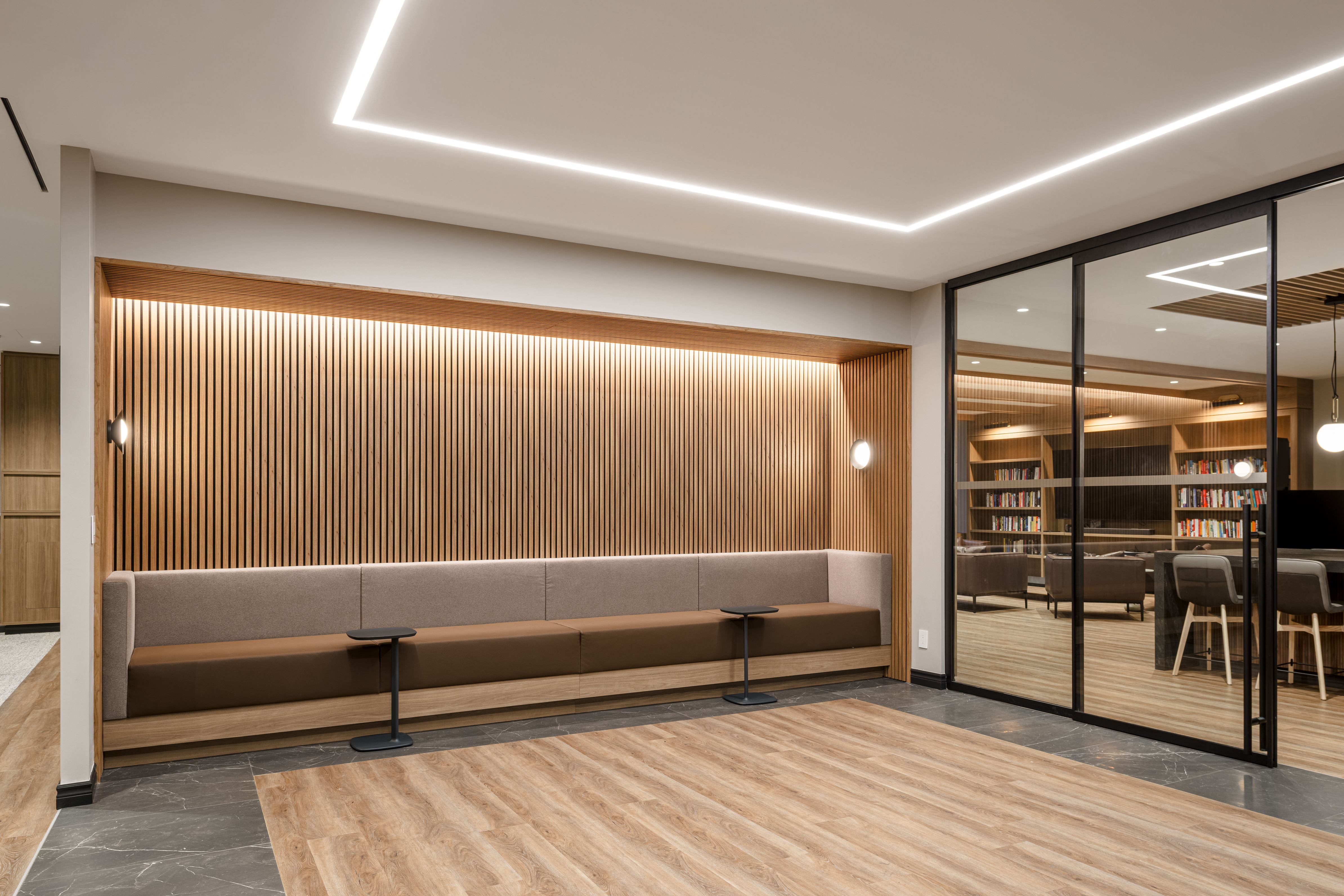 Axis Beam 2 recessed fixtures were used in the boardroom and the open seating area to add visual interest while still delivering adequate light levels for everyday use. Axis Slate fixtures were incorporated between the wooden slats to emphasize architectural details and add depth. In one of the meeting rooms, the Zaneen Snooker fixture introduces a unique feature element, adding character while maintaining the overall sophistication of the space. In the open seating area, the Cleo wall sconce by Kuzco brings an additional decorative layer, contributing to the overall warmth and visual interest of the space. In the lounge area, the Valise Picture wall light by Kuzco was used to highlight the bookcases and TV, adding both functionality and a refined finishing touch.