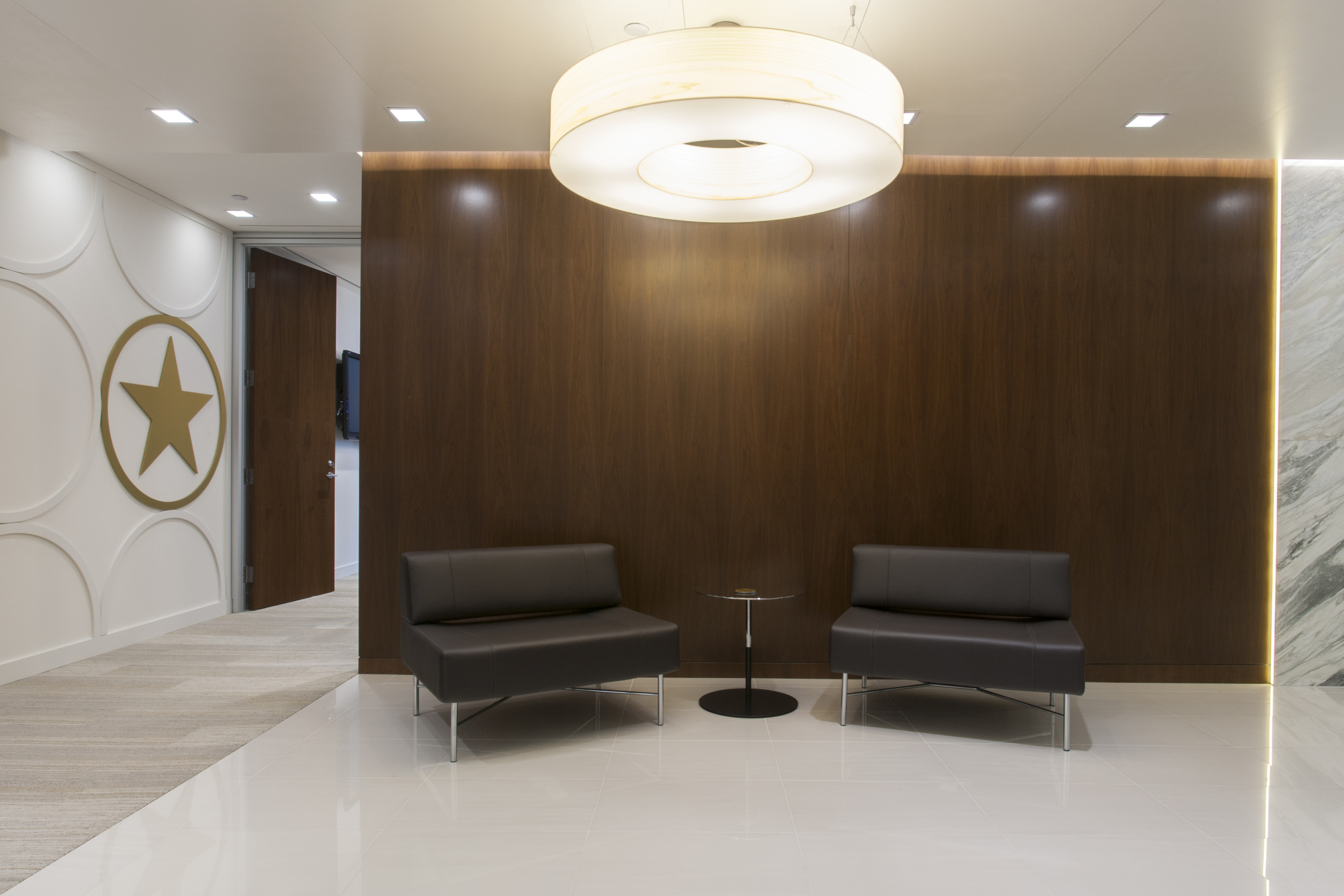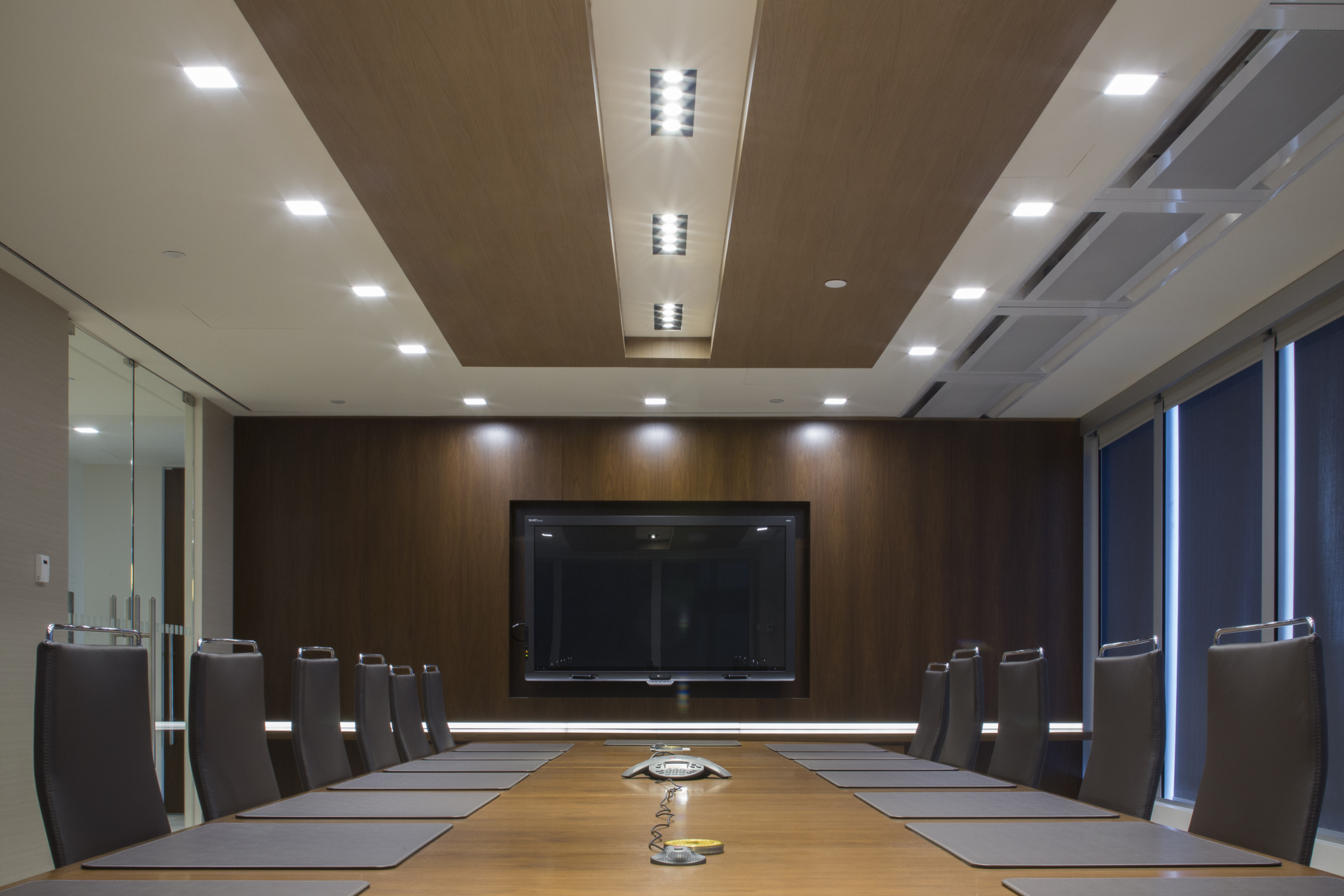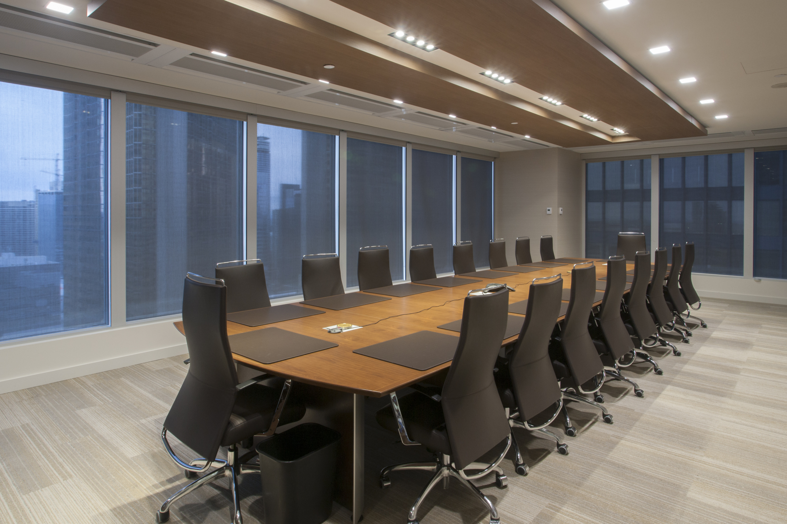 All fixtures installed are LED and Amerlux combo lights are utilized in the boardroom, taking a slightly different approach to lighting this type of space. Crestron controls are used throughout and include the motorized shades seen in the boardroom. Other products include square pot lights from Zumtobel, Foscarini pendants by LightForm installed in the kitchen, SGi Lighting in the cove, Supernovas from Delta Light, and Selux fixtures in the boardroom and reception areas.
