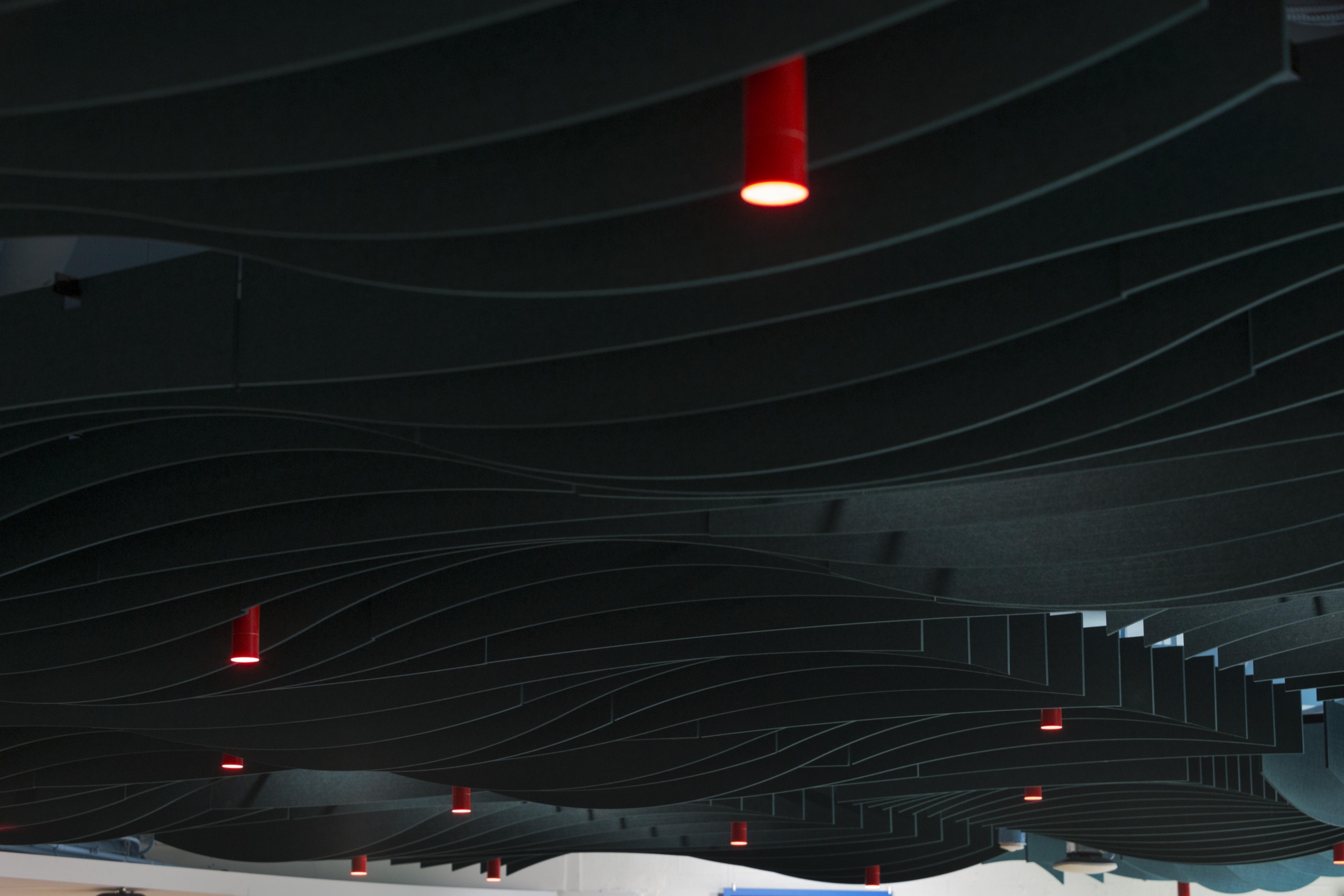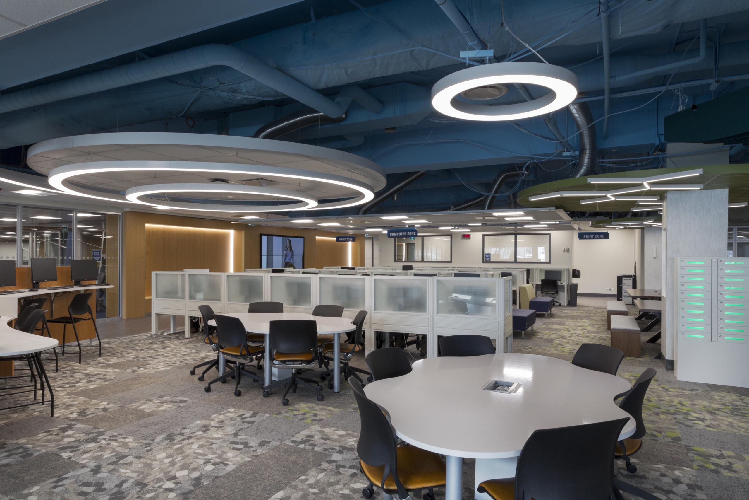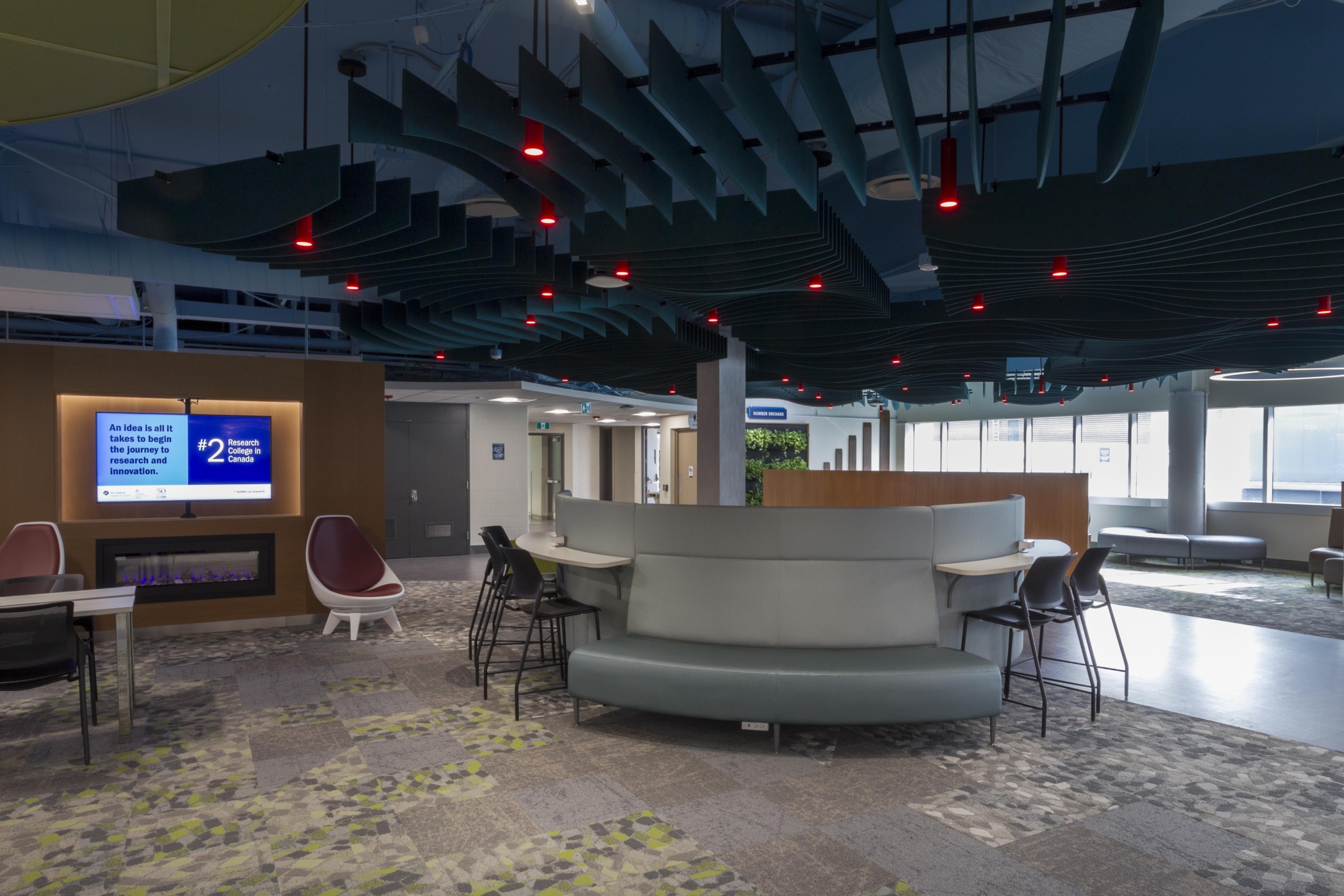 Humber wanted to upgrade their previous spaces in the Humber Business School and Computer Lab. This space was designed for students to collaborate, work independently, or take a break. The Axis fixtures illuminate the entire space with a fresh, modern feel. The theme for the Computer Lab was to bring the outside indoors by creating the “Humber Orchard.” The acoustic panels represent trees complemented by the Axis Stencil system to represent the branches. The Lumenwerx Voila cylinders were also selected along with a custom finish to depict the apples in the orchard.