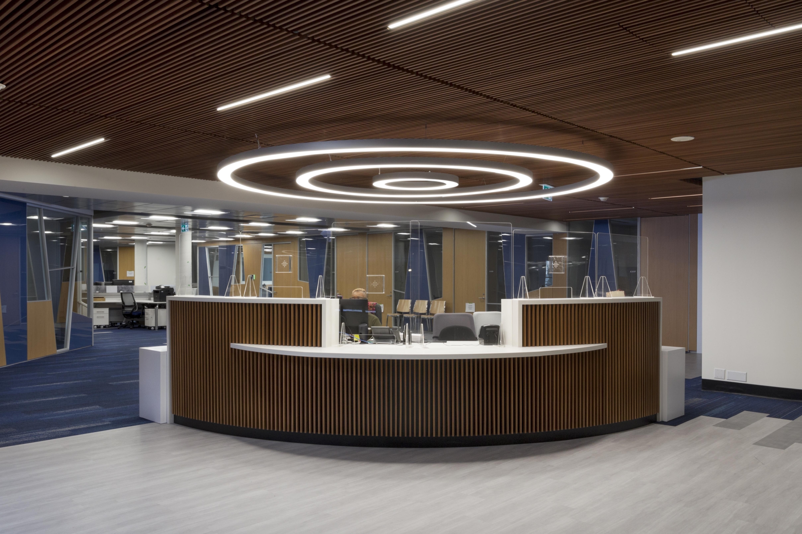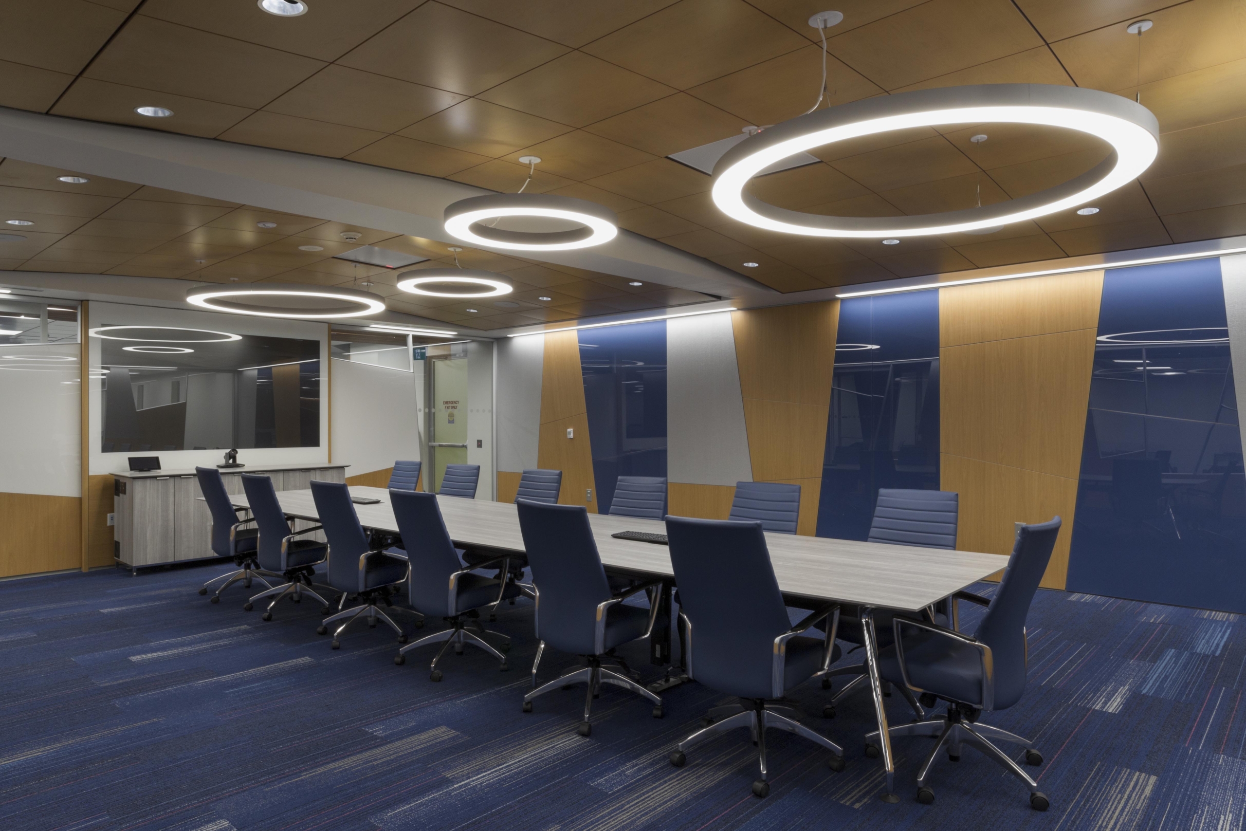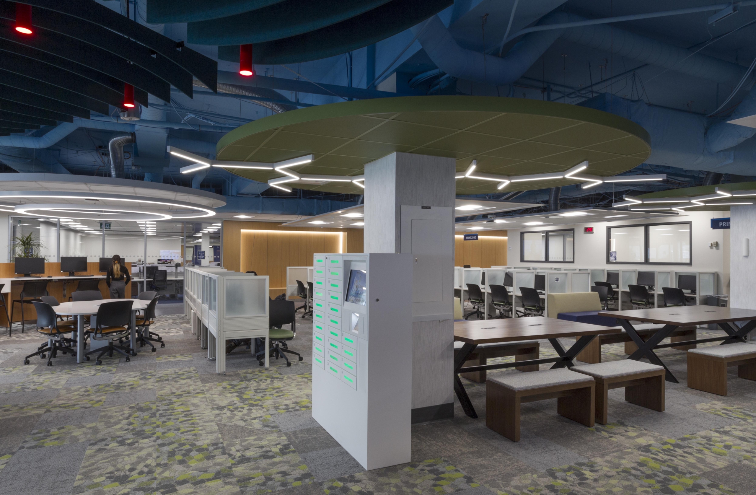 Humber wanted to upgrade their previous spaces in the Humber Business School and Computer Lab. This space was designed for students to collaborate, work independently, or take a break. The Axis fixtures illuminate the entire space with a fresh, modern feel. The theme for the Computer Lab was to bring the outside indoors by creating the “Humber Orchard.” The acoustic panels represent trees complemented by the Axis Stencil system to represent the branches. The Lumenwerx Voila cylinders were also selected along with a custom finish to depict the apples in the orchard.