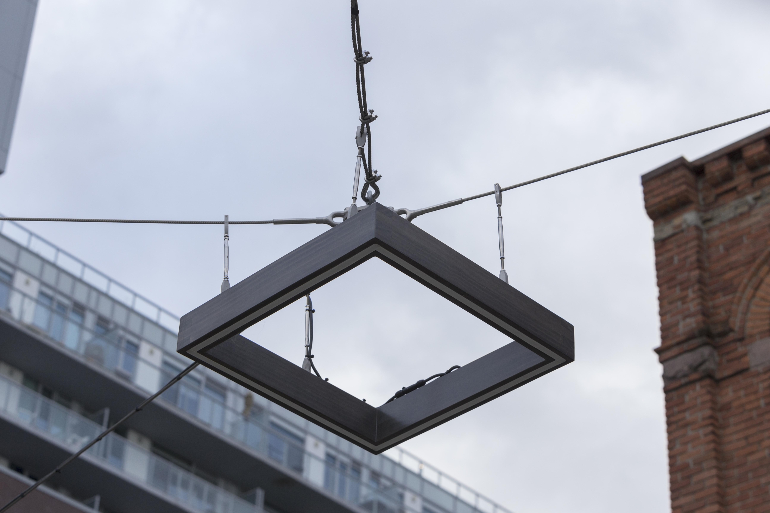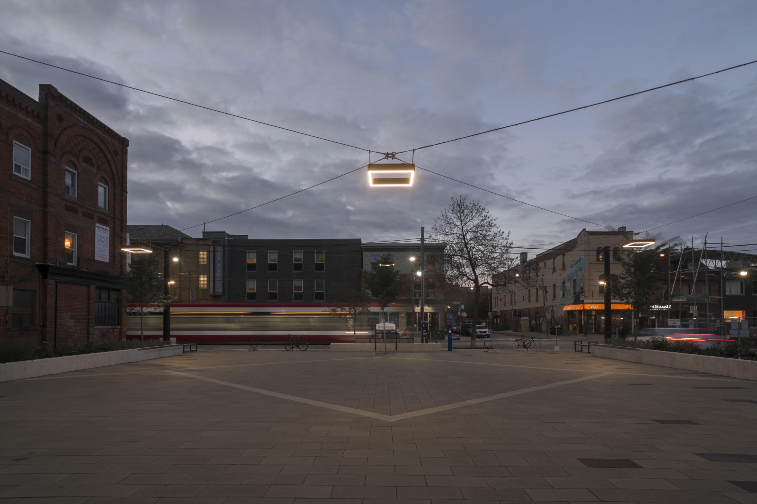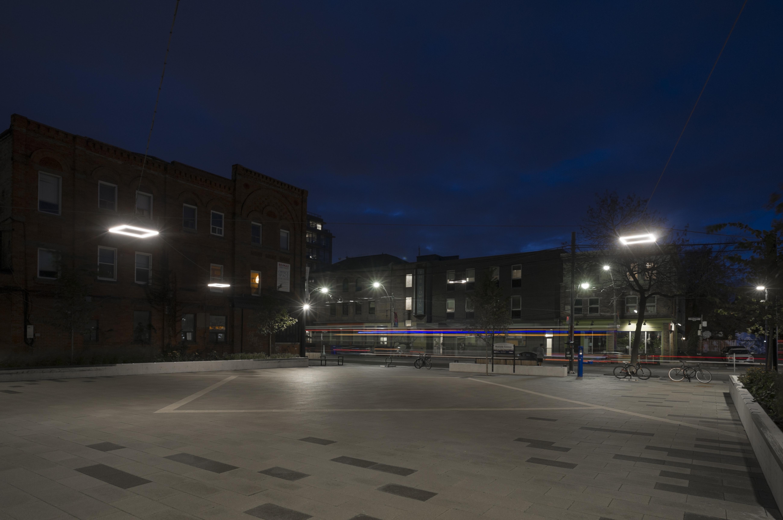 The Planning Partnership and MCW teamed up with Salex to provide a lighting solution that would bring this space to life. Streetcar Developments wanted to incorporate the existing home plate plaque and showcase the historic baseball diamond shape. Catenary lighting was a perfect way to light the park by suspending the lights as if they were floating above, and mimicking the baselines in the pavers below. The catenary system design was developed/engineered using 4 x 18 foot steel poles, and several catenary cables to create the diamond shape and provide the tension required to hang the fixtures at the required height and position. Structura’s Aura square LED pendant was chosen to represent the bases with a custom Aura pendant as home plate. These fixtures were specified with a 100% recyclable Accoya wood finish and 3000K high output LED light engines, overall providing a warm feel and sustainable look. In addition, the Structura Metro luminaires were added on the poles to supplement the base lighting around the perimeter of the park given the spacing constraints of the base locations. This new space is the perfect location for year-round markets, light displays, art, and more!