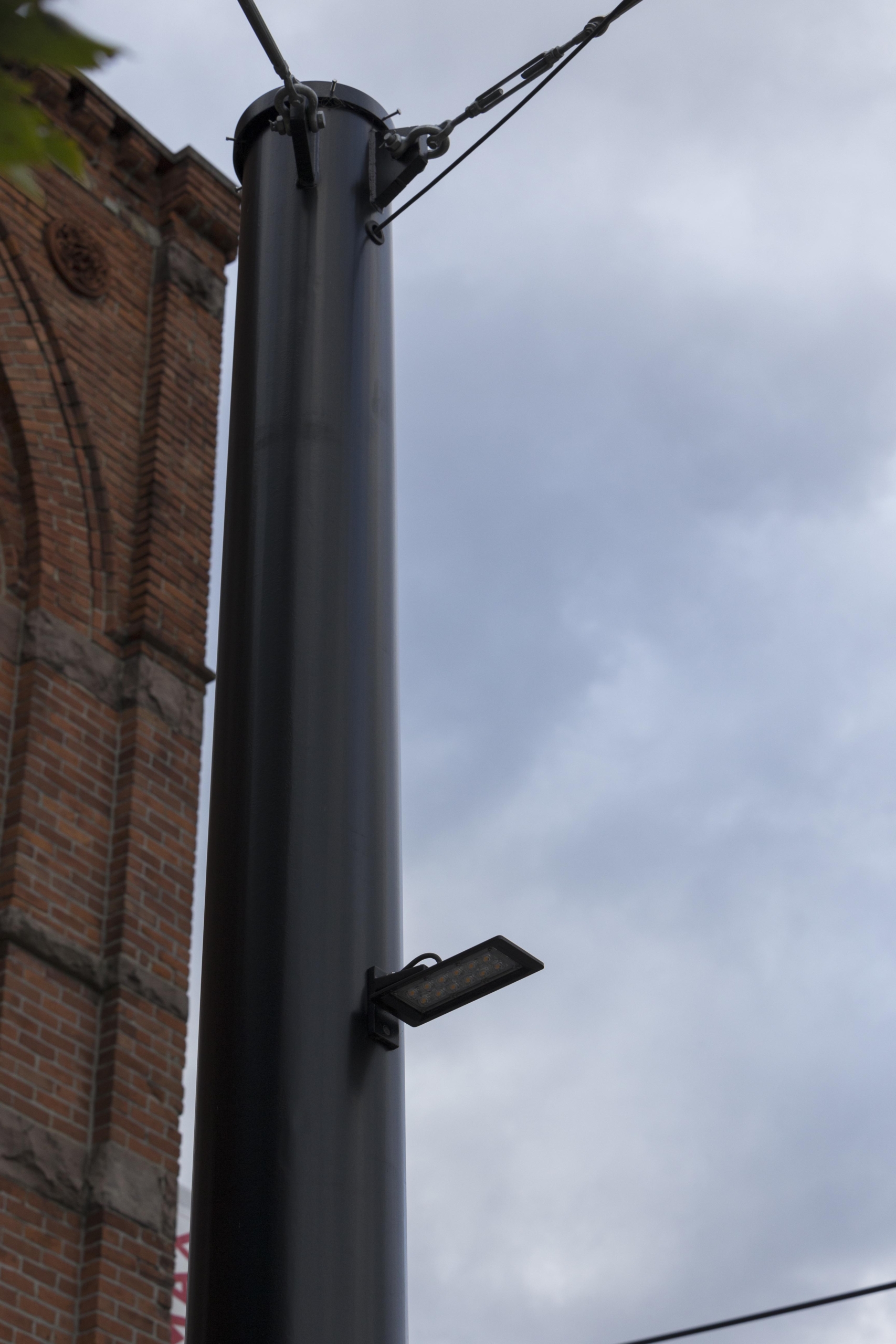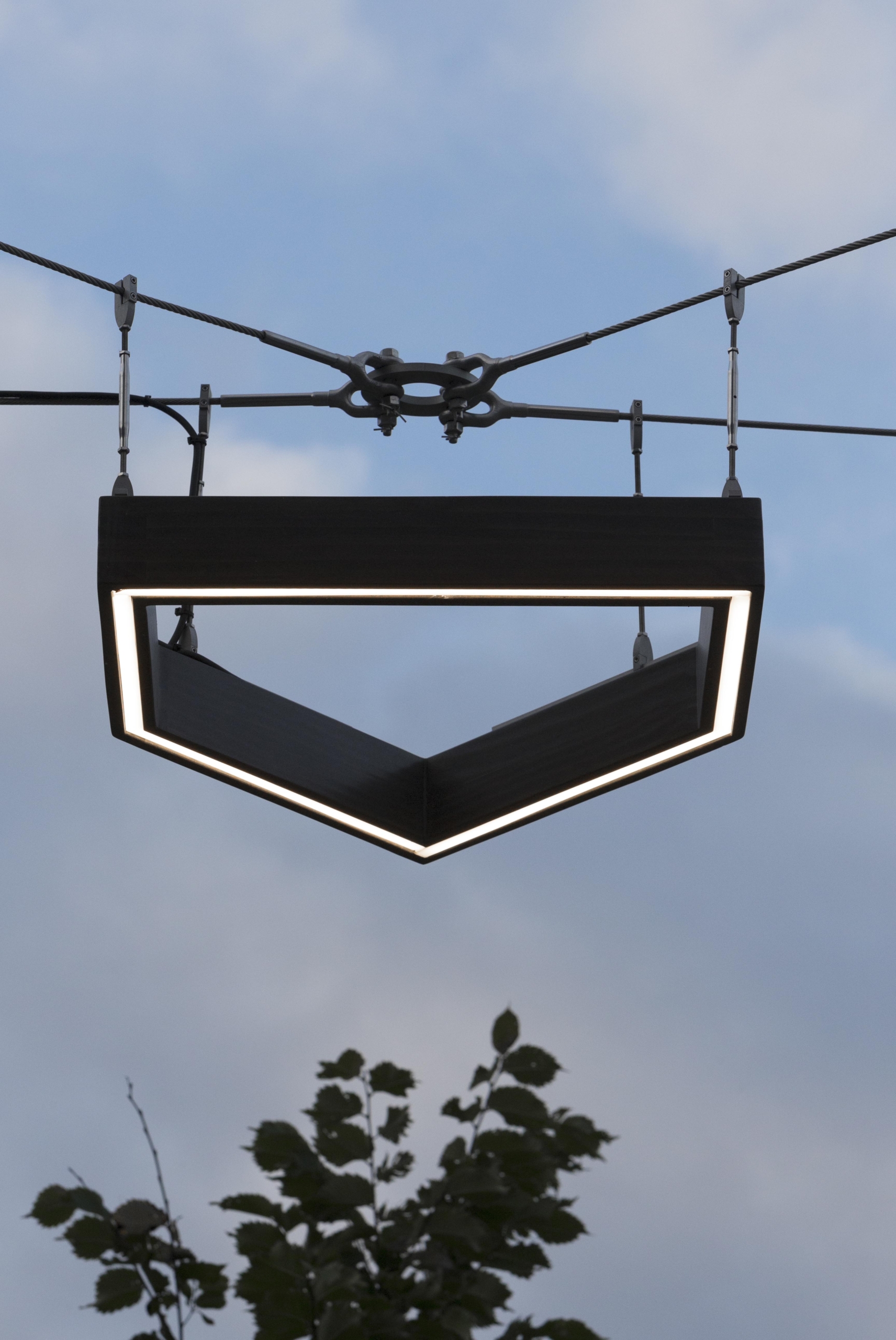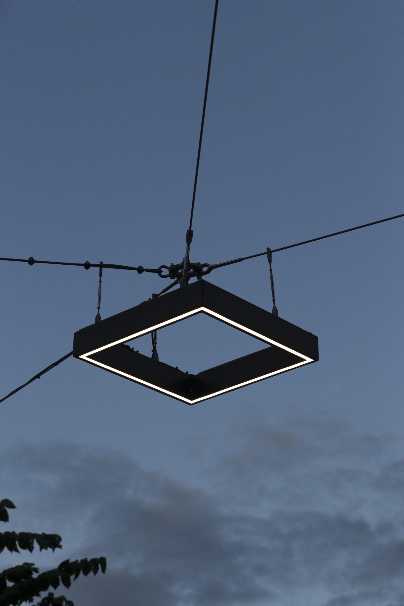 The Planning Partnership and MCW teamed up with Salex to provide a lighting solution that would bring this space to life. Streetcar Developments wanted to incorporate the existing home plate plaque and showcase the historic baseball diamond shape. Catenary lighting was a perfect way to light the park by suspending the lights as if they were floating above, and mimicking the baselines in the pavers below. The catenary system design was developed/engineered using 4 x 18 foot steel poles, and several catenary cables to create the diamond shape and provide the tension required to hang the fixtures at the required height and position. Structura’s Aura square LED pendant was chosen to represent the bases with a custom Aura pendant as home plate. These fixtures were specified with a 100% recyclable Accoya wood finish and 3000K high output LED light engines, overall providing a warm feel and sustainable look. In addition, the Structura Metro luminaires were added on the poles to supplement the base lighting around the perimeter of the park given the spacing constraints of the base locations. This new space is the perfect location for year-round markets, light displays, art, and more!