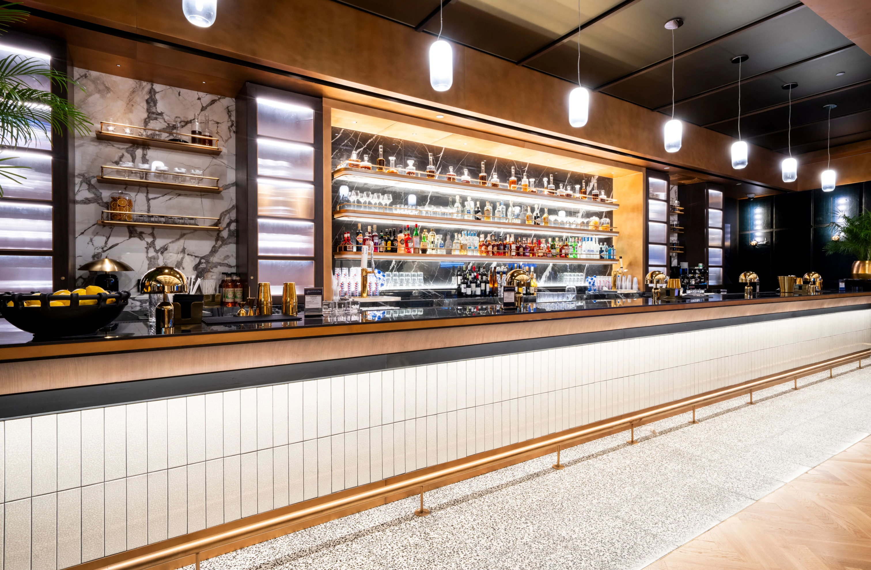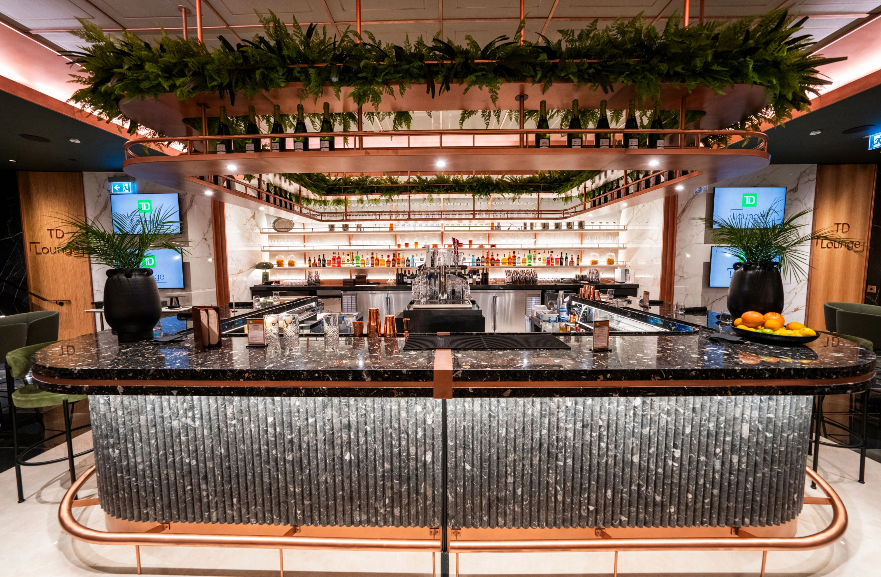 TD Lounge: Lightheaded Puck Lights illuminate the bar area with a refined glow, while downlights throughout the lounge provide balanced lighting for a seamless guest experience.