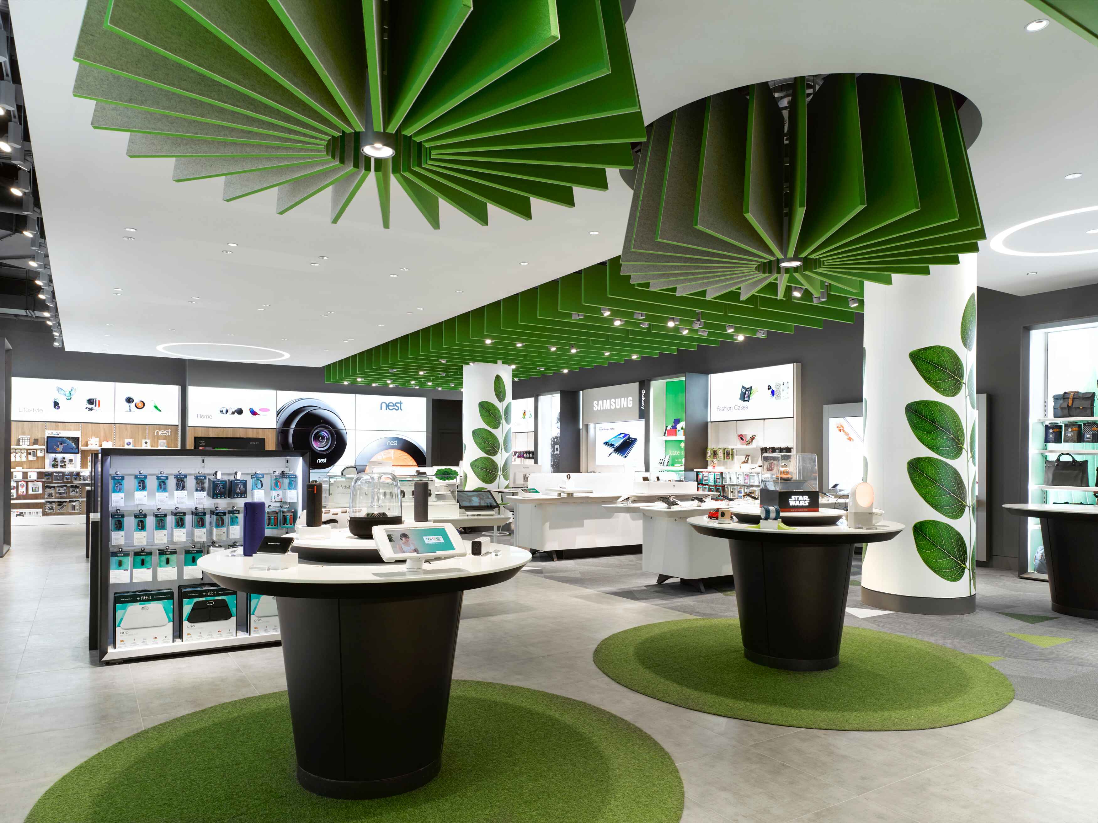 A selection of fixtures from Amerlux and Axis Lighting were used throughout the TELUS Eaton Centre store. Lit entirely with LED fixtures, the majority of the store is illuminated with the Cylindrix III Mini (vertical track accent) and Evoke (round trimless downlight) fixtures from Amerlux. The placement of the Amerlux Rook 475 Pendant (cylindrical downlights) creatively showcases the store’s standing circular displays.