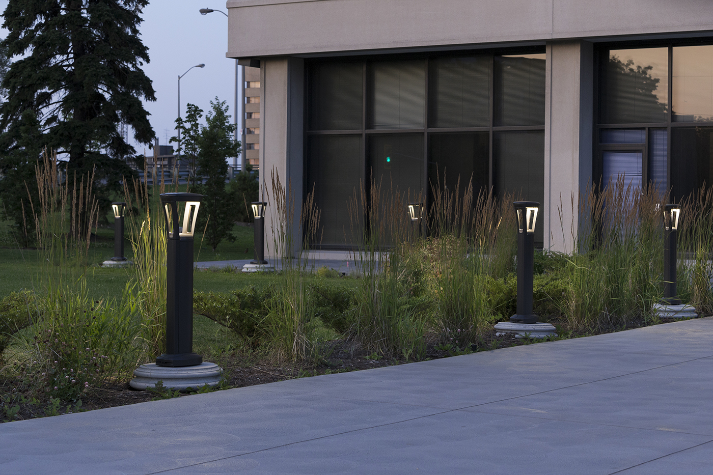Given the challenge of designing for an older build, outdoor lighting was specifically chosen to blend the old design with the new. To illuminate the pathway that directs visitors towards the main entrance, Lumca’s LU-BA bollards were chosen, helping to keep the pathway guided and easily seen. To brighten the building’s perimeters, Lumca’s LUUMA pole mounted fixtures were installed to disperse light so that the area was properly lit for employees and visitors during nightfall.