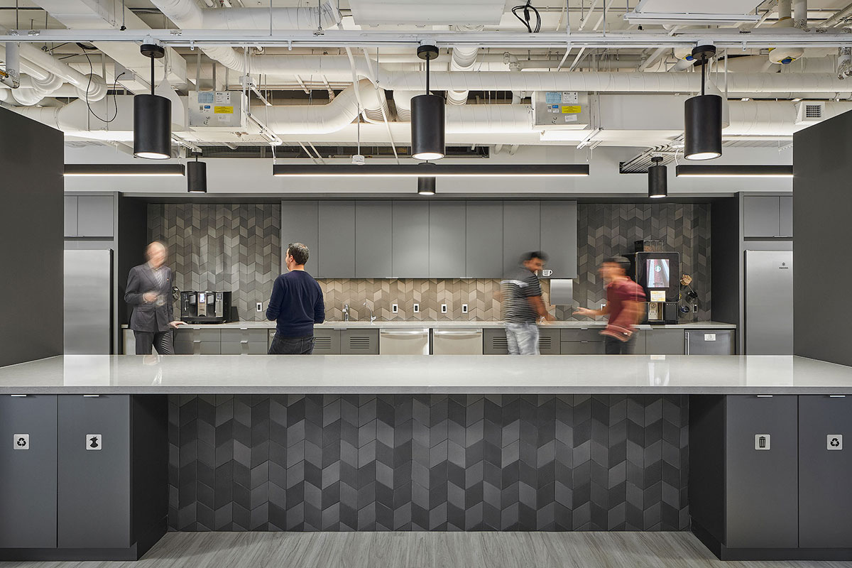 Together with B+H Architects and Smith + Andersen, Salex transformed a number of TMX’s communal spaces – namely kitchen and lounge area, elevator lobbies and corridors, as well as the open office – with a forward-facing lighting design. ARTEMIDE Ledbar 48 Square decorative wall sconces were implemented in the kitchen and lounge area to achieve a modern, clean and linear appearance, while Axis Sculpt Recessed linear fixtures were used in the elevator lobbies to create continuous, illuminated patterns. Spanning across three walls, the ceiling and challenging angle joints, these complex patterns were supplemented with classic LED MINIGRID IN TRIMLESS SI downlights from Delta Lighting.