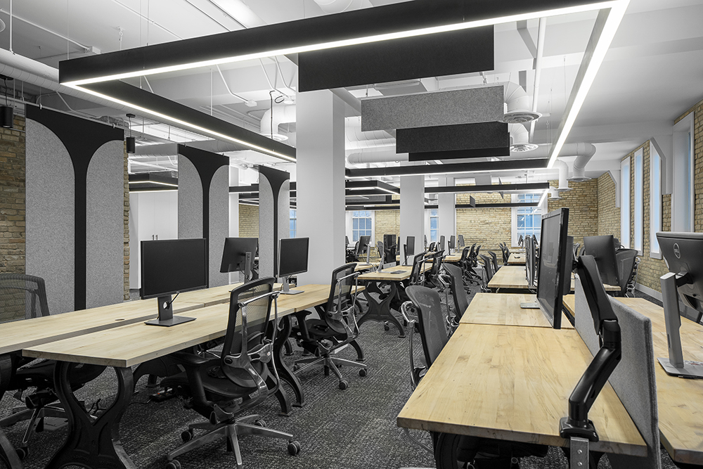 Vidyard relocated offices to a historic brick and beam building in Downtown Kitchener, Ontario. Lighting was used throughout the two floors of office space. There were low ceiling height constraints in the building but, the slim profile of the Axis Beam really worked in the open office space to produce high-performance lighting. The Senso Leto 11 Cylinders were used to provide general light in both the kitchen area and the boardroom space as well as corridor lighting throughout. The decorative items from Kuzco and Alora add strong statement pieces throughout the project providing Vidyard with the ability to create flexible working environments.