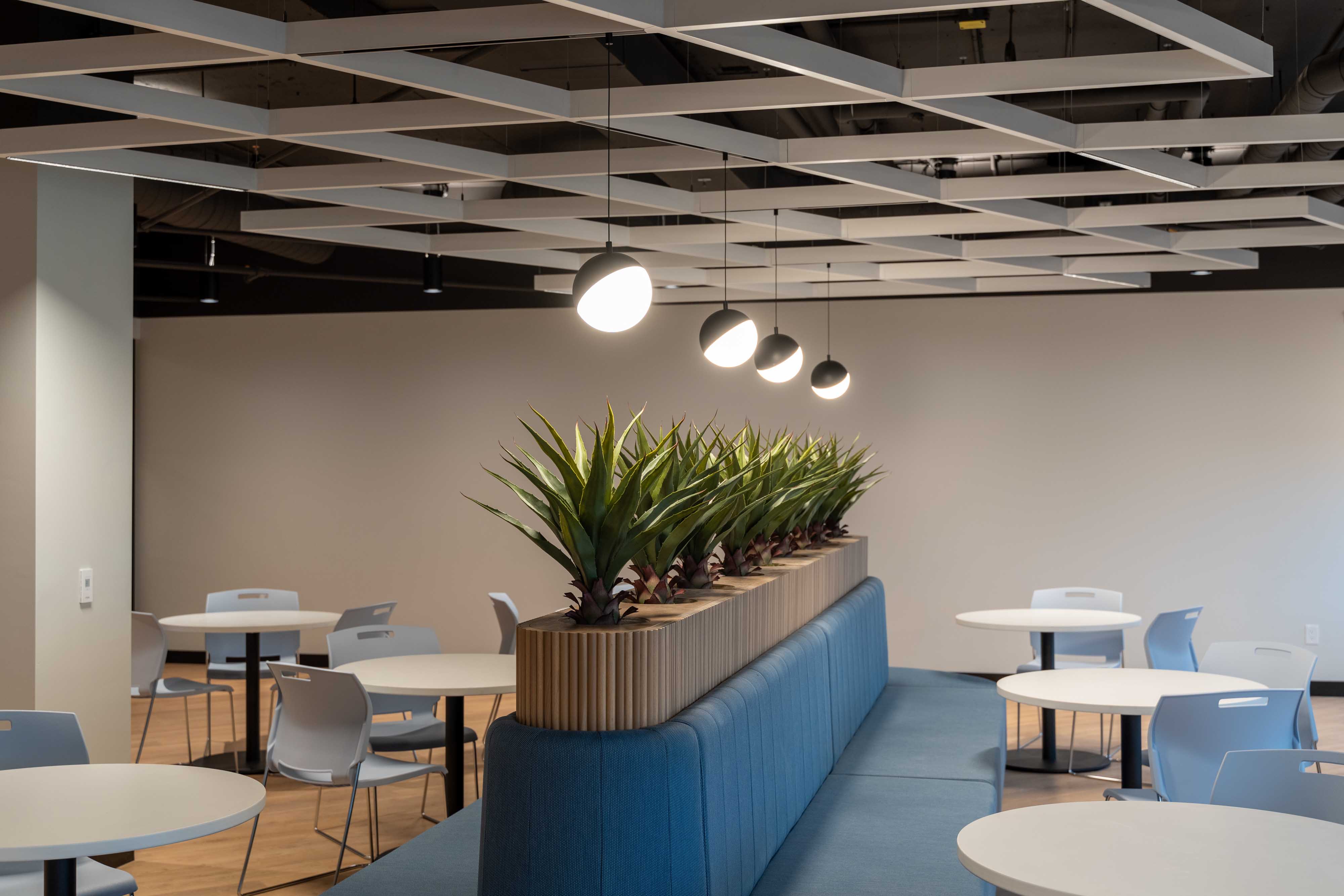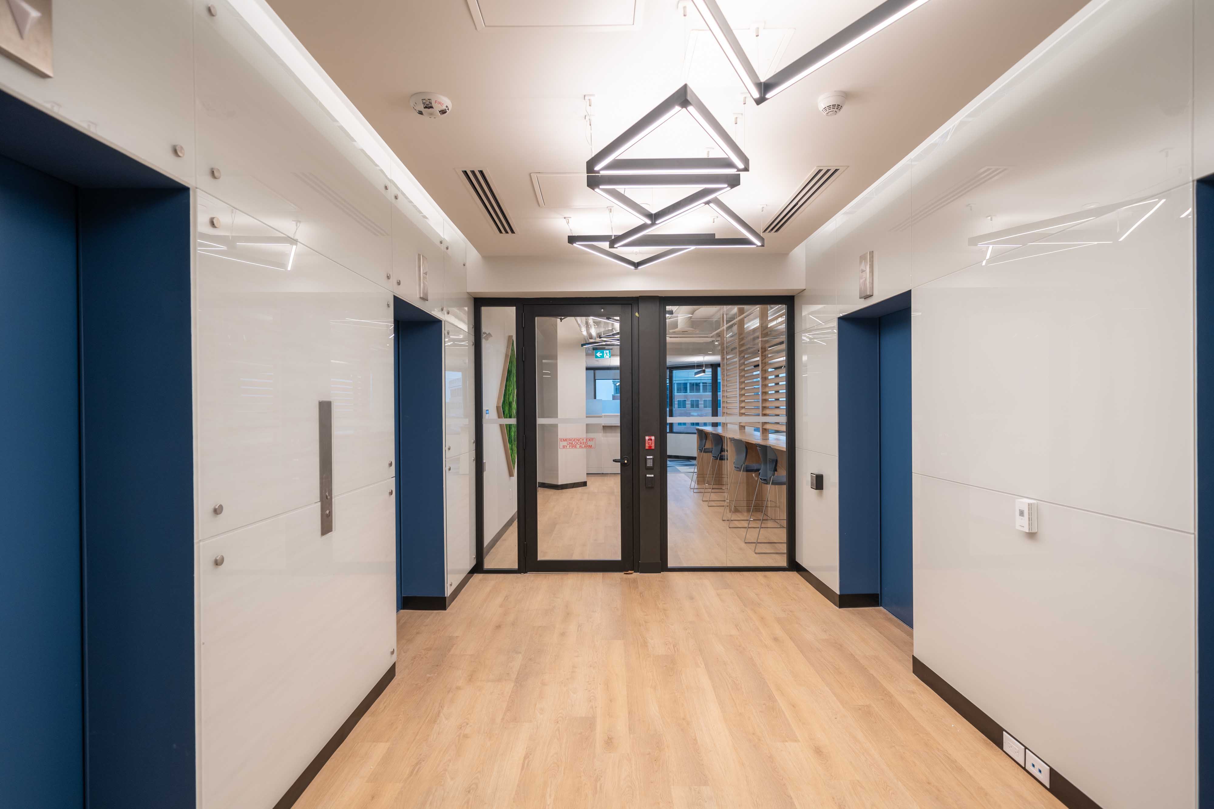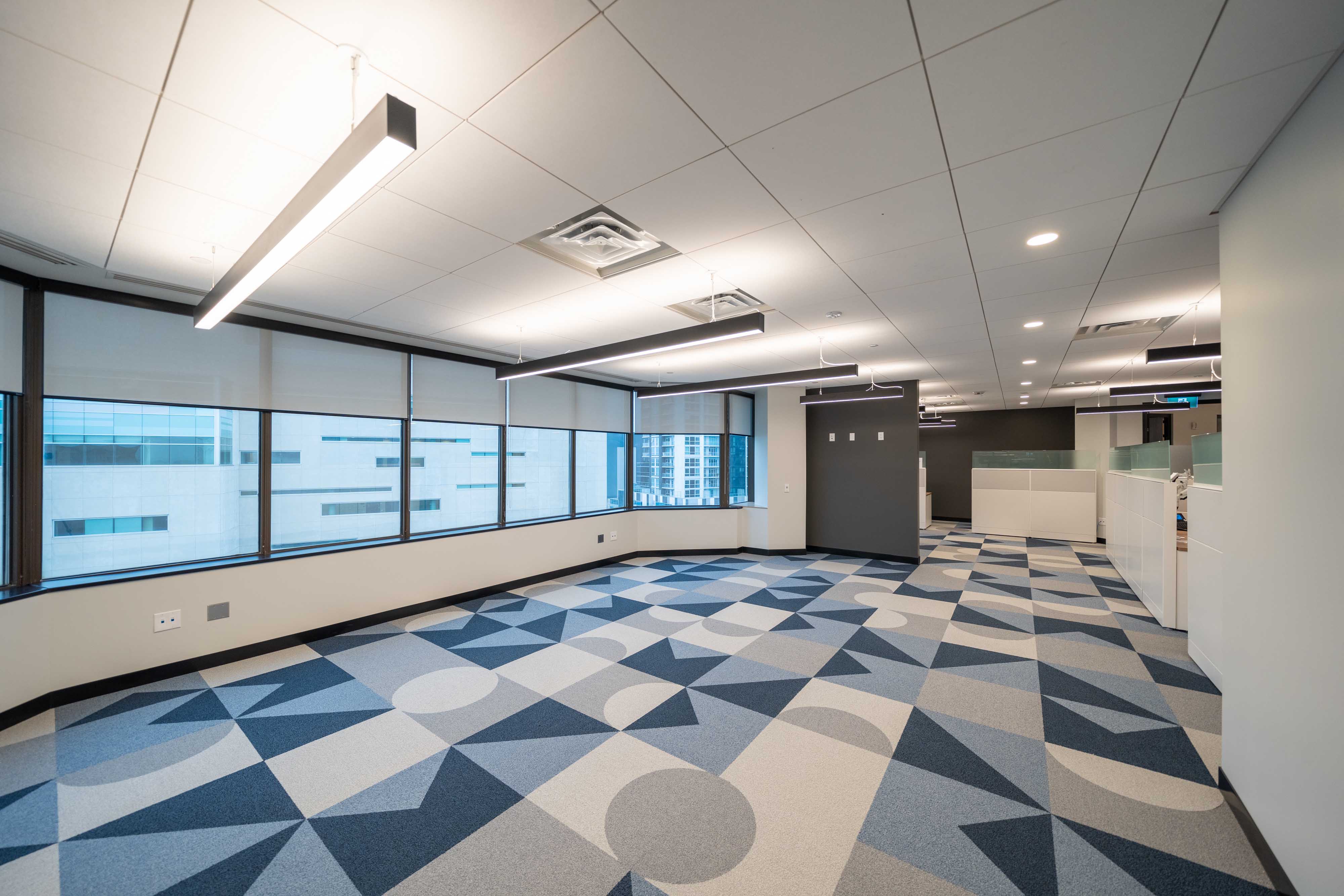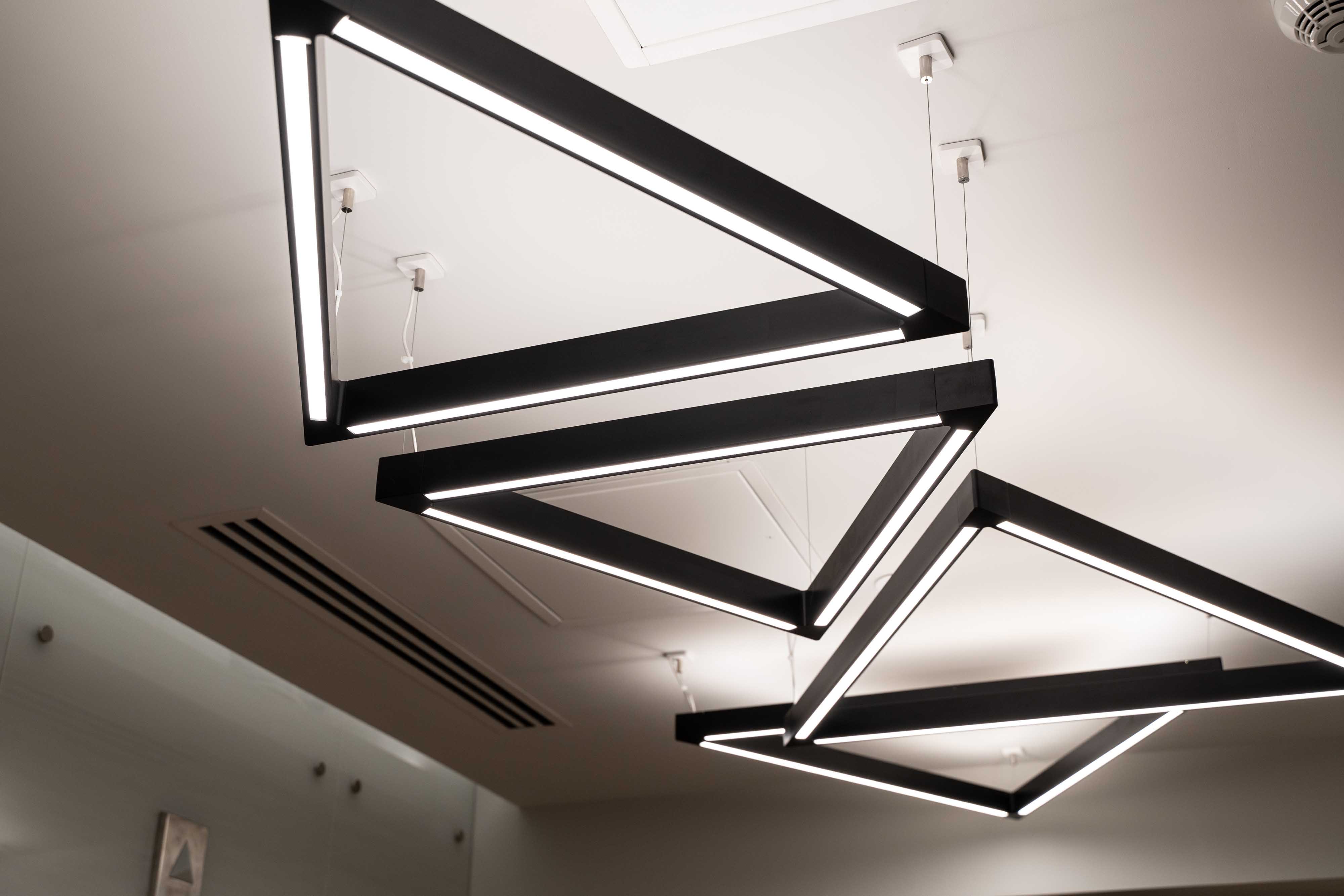 The Axis StencilFlex was used in the open seating areas to add a unique design element. The Elite FPR Cylinders are featured in the kitchen in different lengths and facing different directions for a dynamic look and feel. The Axis Beam 2 is used over office cubicles and work spaces. Lastly, the Axis Stencil Forms were used in the elevator lobby. The triangle shapes come together to create a visually appealing entrance. Overall the WFCU office space achieves a cohesive ambiance through its simple and sleek yet, fun lighting selections.